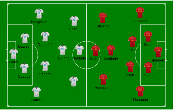 O Tottenham passou a partida inteira sem acertar sequer um chute na direção do gol defendido por Simon Migolet. O Liverpool, por sua vez, foi letal com 20 finalizações, metade delas à meta. A vitória dos comandados de Brendan Rodgers, já bem construída no primeiro tempo, quando fizeram 2 a 0, virou certeza quando Paulinho foi expulso por acertar um chute no peito de Luis Suárez, antes da metade da segunda etapa.