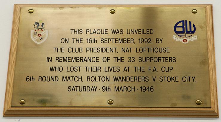 O Bolton inaugurou uma placa, em 1992, para homenagear os 33 mortos, alguns anos antes de se mudar para um novo estádio. O local onde ficava o Burnden Park hoje em dia é um supermercado, que mantém a placa em uma de suas paredes. Evidentemente, esta semana foi de luto. A bandeira do clube no Macron Stadium está hasteada a meio pau desde sábado. Na última terça-feira, houve um minuto de silêncio antes da partida contra o Ipswich, pela segunda divisão. A revista desse jogo também foi especial, com histórias do dia do desastre. Houve um memorial nesta quarta, com a inauguração de um livro de lembranças na recepção do estádio, com os nomes de todos falecidos, que também estarão na camisa dos jogadores na partida de sábado, contra o Preston North End.