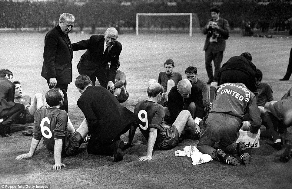 Os 15 minutos finais do primeiro tempo em Madri foram desastrosos ao Manchester United. Pirri, Gento e Amancio anotaram os gols do Real Madrid, embora um tento contra de Zoco mantivesse as esperanças dos mancunianos. Então, no intervalo, aconteceu um mítico discurso de Matt Busby. “Você podia sentir as lembranças de Munique em certos momentos da campanha, particularmente no intervalo das semifinais, quando perdíamos por 3 a 1. Era a maneira como Matt falou conosco e também Jimmy Murphy – tão fervente, como se trouxesse isso de Stretford End [o setor das arquibancadas onde a torcida é mais intensa em Old Trafford] para dentro dos vestiários. Busby não estava feliz com nossa atuação e disse que, se fizéssemos o próximo gol, ganharíamos”, declarou o meio-campista Pat Crerand, em entrevista à BBC.