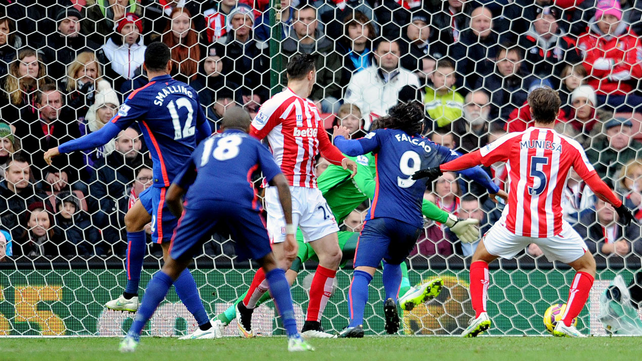 O gol de empate, porém, veio ainda no primeiro tempo. Escanteio cobrado por Rooney, Michael Carrick tocou de cabeça e Falcao marcou desviando para as redes, aos 26 minutos. Poderia indicar que os Diabos Vermelhos pressionariam em busca da virada. Bom, tentaram, mas o time ainda está longe de funcionar bem o suficiente para impor uma pressão realmente forte em um time tão organizado como o Stoke, que se preocupa basicamente em defender.