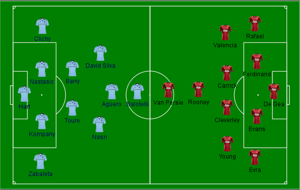 A formação do United indicava um time ofensivo, mas o United se armou bem na defesa. O time se armava em um 4-4-1-1, com Rooney atrás de Van Persie e recompondo a defesa como um meio-campista, algo que se acostumou a fazer nesta temporada. O técnico Roberto Mancini surpreendeu ao entrar em campo com Mario Balotelli no ataque e Tevez no banco.