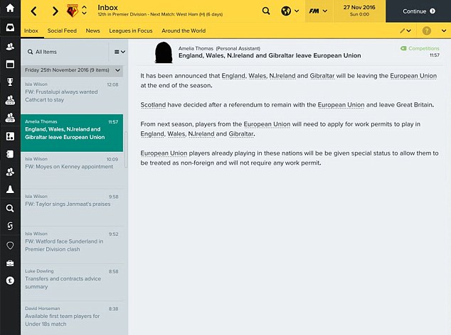 É a primeira vez que política influencia o simulador, mas, segundo Miles Jacobson ao Telegraph, o responsável pelo jogo, o Brexit era grande demais para ser deixado de fora. O problema é que ninguém sabe ainda exatamente qual será o cenário do futebol inglês depois que as negociações forem concluídas. Por isso, o FM 2017 contém todas as possibilidades existentes e usa inteligência artificial e porcentagens para fazer cada save diferente do outro. Em algum momento entre dois e dez anos dentro da sua aventura, você será notificado que as negociações começaram. Um ano depois, receberá um boletim com o impacto do Brexit.