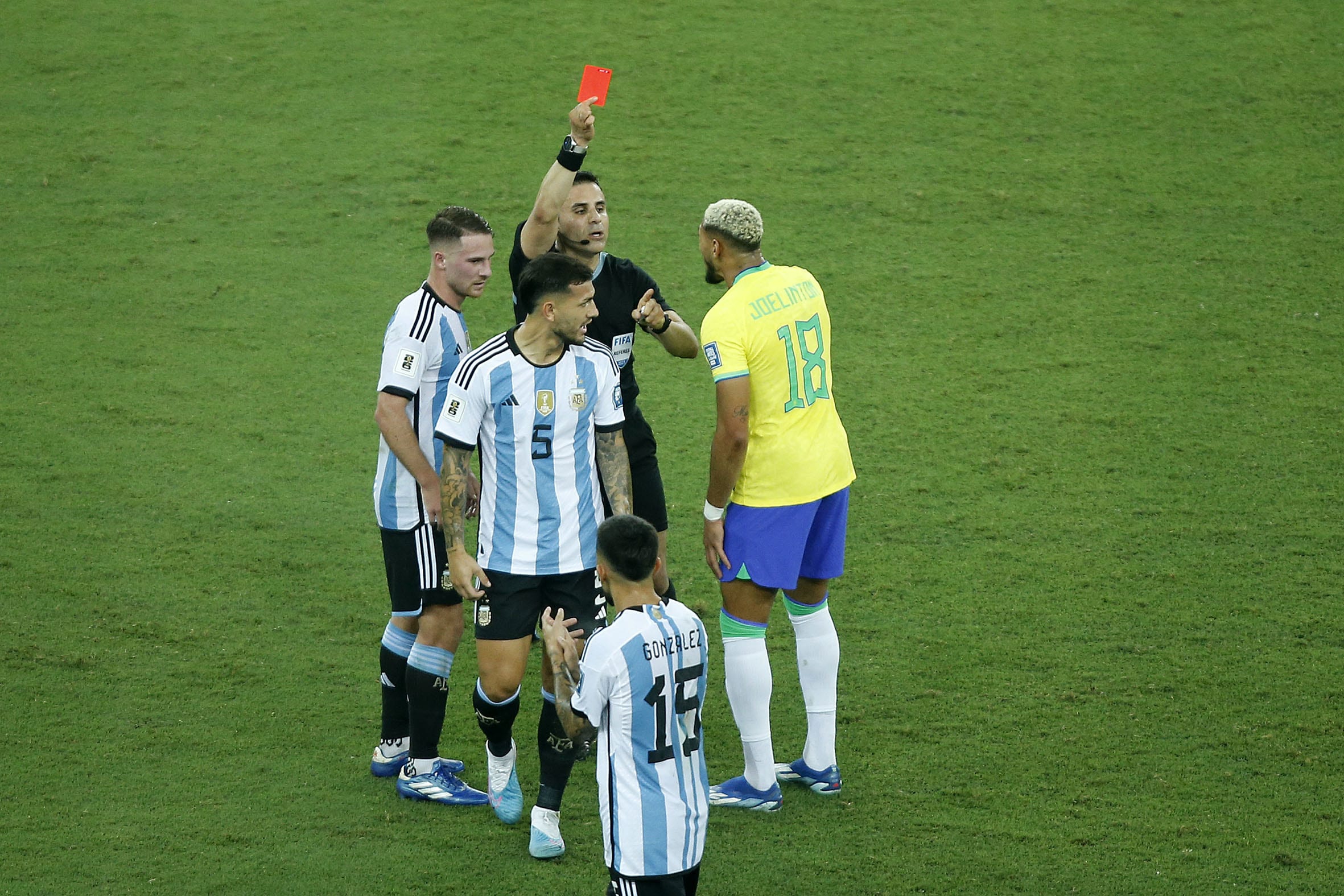 Joelinton foi expulso aos 36 minutos do segundo tempo, quando o Brasil já perdia por 1 a 0 para a Argentina. O volante recebeu o cartão vermelho direto após um empurrão em Rodrigo de Paul. No lance, o árbitro considerou que o jogador brasileiro agrediu o atleta argentino. Revoltado com a situação, ele argumentou com o juiz que havia sofrido falta antes e não atingiu o rosto do adversário.