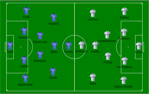 Durante o primeiro tempo, prevaleceu o talento dos Blues. Juan Mata, Ramires e Oscar se combinavam bem no meio-campo e ajudaram a equipe a ser mais direta nas ações ofensivas. Marcaram dois gols e criaram bem mais chances. Do outro lado, o Tottenham tinha dificuldades para se encontrar na frente e só chegou ao gol graças a um lance individual de Emmanuel Adebayor.