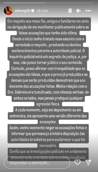 – Em respeito aos meus fãs, amigos e familiares, me sinto na obrigação de me manifestar publicamente sobre as falsas acusações que tenho sido vítima. Desde o início tenho tratado esse assunto com seriedade respeito, prestado os devidos esclarecimentos à autoridade policial. O inquérito policial está sob segredo de Justiça, e, por isso não posso tornar público o seu conteúdo. Contudo, posso afirmar com tranquilidade que as acusações são falsas, e que a prova já produzida e as demais que serão produzidas demonstram que eu sou inocente das acusações feitas. Minha relação com a Sra. Gabriela era tumultuada, com ofensas verbais de ambos os lados, mas jamais pratiquei qualquer agressão física. A cada momento, seja em depoimento ou em entrevista, ela apresenta uma versão diferente das acusações. Assim, venho veementemente negar as acusações feitas e informar que permaneço à inteira disposição das autoridades brasileiras para esclarecer o que for necessário. Confio que as investigações policiais em andamento demonstrarão a verdade sobre a minha inocência.