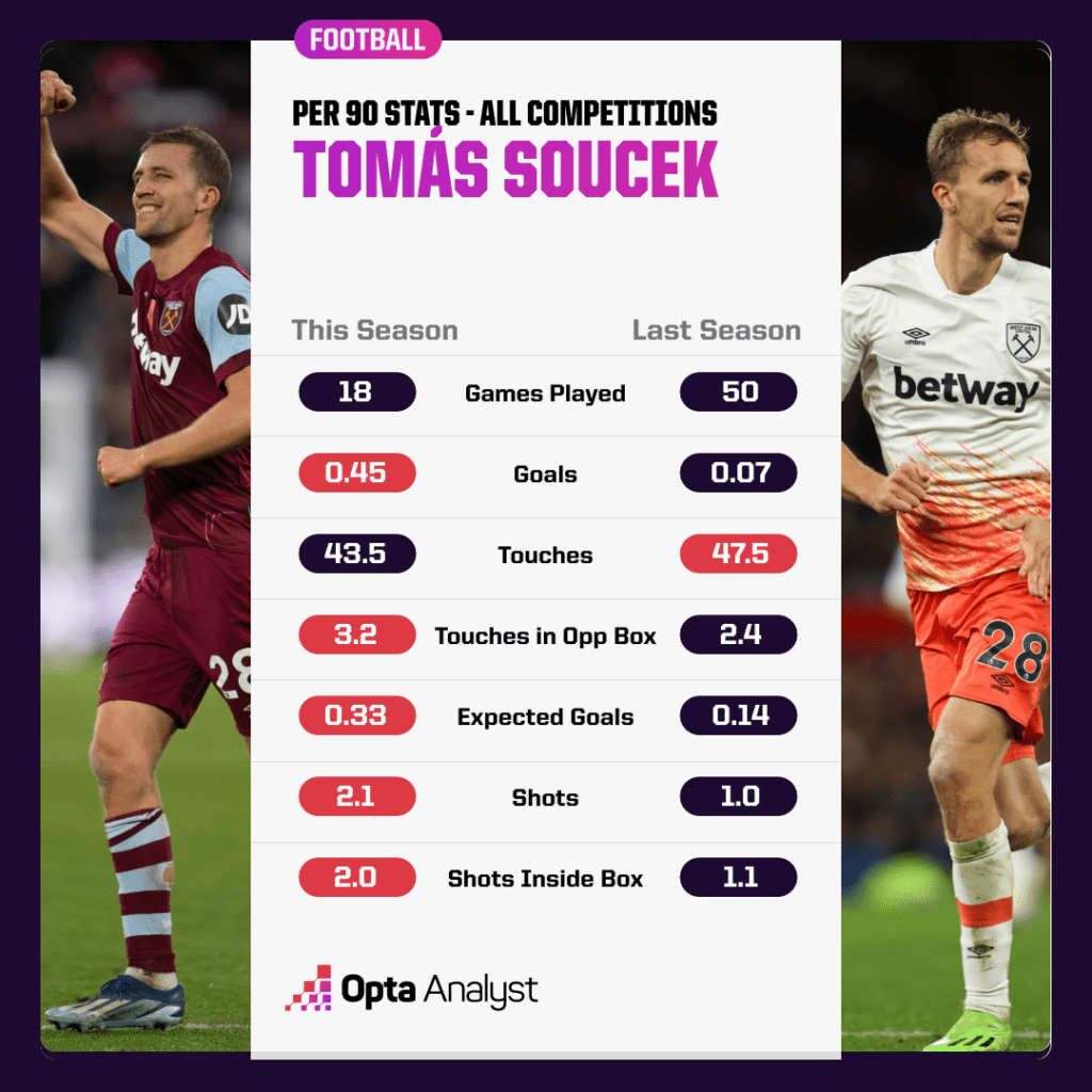 Sem Rice, Soucek ganhou Ward-Prose e Álvarez como companhia no meio campo, o que fez com que ele pudesse se dedicar mais ao setor ofensivo. Não à atoa agora vive uma temporada que pode ser considerada goleadora. O site especializado em estatísticas, Opta, fez um levantamento há algumas semanas que provava como ele, nessa temporada, tem mais ações na área adversária, gols esperados e chutes do que já teve em toda a sua carreira com a camisa dos Hammers.