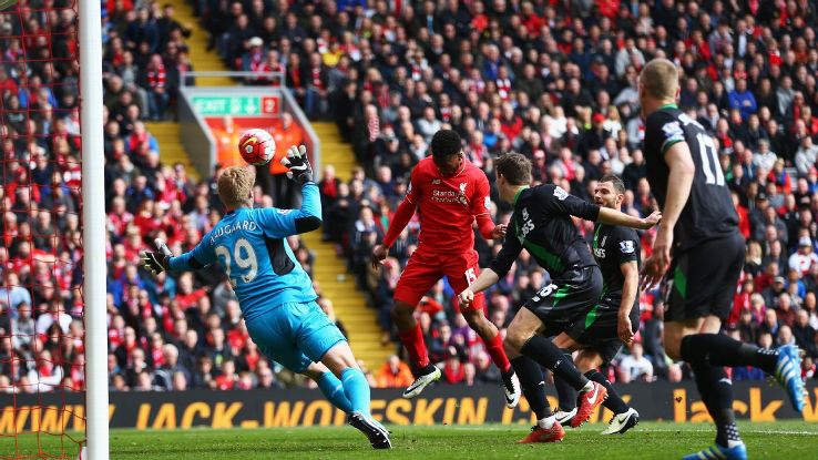 Neste domingo, Alberto Moreno abriu o placar logo a oito minutos, mas aos 22 Bojan, de cabeça, no meio da defesa, empatou o jogo. Foi então que veio a grande atuaçãod o ataque. Daniel Sturridge marcou o segundo, aos 32 minutos. No segundo tempo, com Divock Origi em campo, vieram mais dois gols, os dois dele. Primeiro aos cinco minutos do segundo tempo. Depois, aos 20, que fechou a conta. E o time não fez mais porque diminuiu o ritmo, já que teve volume para chegar a cinco, seis gols tranquilamente.