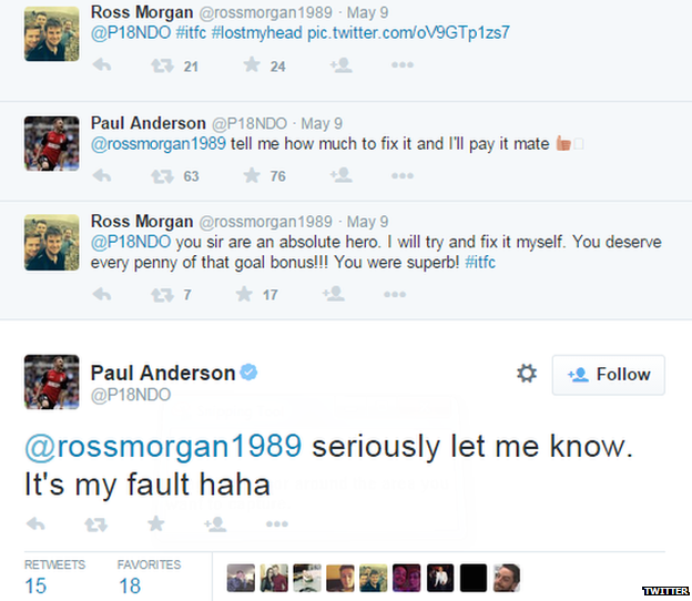 Ross Morgan, um vendedor de 25 anos de Wetherby, tirou uma foto dos danos que causou ao teto e enviou para Anderson no Twitter, segundo ele, apenas para brincar. A resposta do jogador foi a seguinte: “Me fala quanto custa para consertar que eu pago, amigo”. Não precisa, seu Anderson, eu estava apenas brincando, você merece o dinheiro que recebeu por aquele gol, foi mais ou menos a resposta. “Sério, me fala quanto foi. A culpa foi minha haha”, respondeu Anderson.