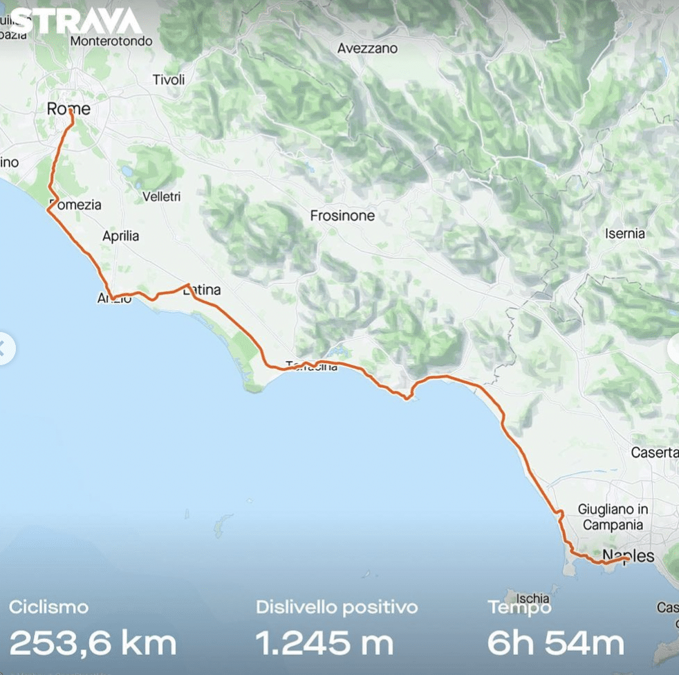 Fabio Cannavaro prometeu e cumpriu: em homenagem ao primeiro título italiano do Napoli desde 1990, subiu na bicicleta e pedalou 253 kms entre Roma e Nápoles, ao lado de amigos, como o ciclista profissional Valerio Agnoli. Ele completou a jornada ao longo da costa oeste, com altitude de 1.245 metros, em seis horas e 54 minutos e velocidade média de 37 kms/h.