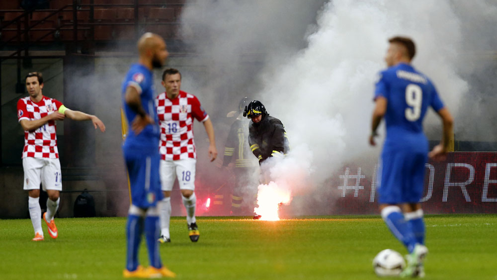 A Itália recebeu a Croácia em San Siro neste domingo pelas Eliminatórias da Eurocopa e se o jogo prometia pelo fato de ser uma seleção tradicional contra outra tecnicamente muito boa, o que se destacou na partida foram os sinalizadores. Os visitantes interromperam a partida duas vezes, no primeiro e no segundo tempo, atirando os objetos em campo. No segundo, foram dezenas de sinalizadores atirados e o jogo foi interrompido.