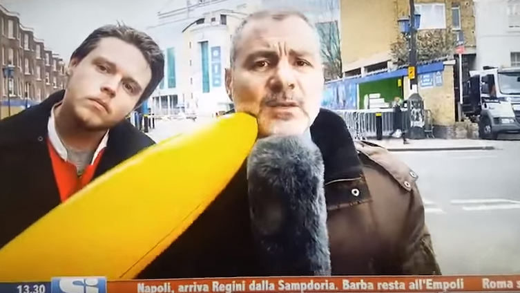 Enquanto o repórter fazia a sua entrada ao vivo, o torcedor pentelho apareceu com uma banana inflável – objeto que costuma ser comum em estádios pela Europa desde a década de 1980, sem ter necessariamente conotações racistas. E o chato começou a acariciar o jornalista justamente enquanto ele fazia o seu relato. Deu ruim. Mas, considerando o tom cômico que alguns canais italianos fazem em suas coberturas, dá para desconfiar que tudo tenha sido armado. Tire suas próprias conclusões: