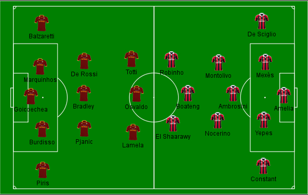 Um clássico desequilibrado. Em um jogo que tirou o melhor das suas características, a Roma fez gato e sapato da defesa do Milan, vencendo por 4 a 2. Isso porque o time tem um estilo direto, de ataques verticais, rápidos e de poucos toques na bola, com um centroavante muito forte fisicamente e jogadores capazes de passes incríveis e movimentação intensa – Lamela e Totti. O capitão é um jogador imprevisível, podendo finalizar das mais diferentes distâncias ou deixar companheiros na cara do gol. Lamela surgiu como um jogador de passe no River Plate, mas nesta temporada mostra a sua capacidade como finalizador. Não por acaso marcou dois gols. Osvaldo, inteligente, é um centroavante que abre espaço para os outros atacantes chegarem. E a destreza de De Rossi no meio foi suficiente para os giallorossi dominarem o setor.
