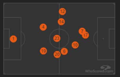 O técnico Massimiliano Allegri levou a campo um time com três atacantes: Cristiano Ronaldo, Paulo Dybala e Mario Mandzukic. Os três se movimentando muito, mas com Mandzukic e Ronaldo se revezando como o jogador mais centralizado nos ataques. Na média de posicionamento, Cristiano Ronaldo normalmente fica um pouco mais à esquerda, com Mandzukic sendo o ponta de lança, mais à frente. Dybala vem um pouco mais de trás, normalmente mais pela meia direita.