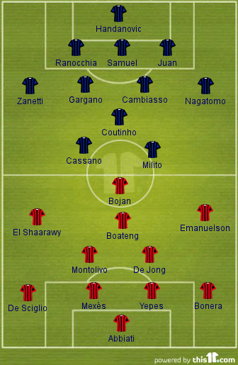 Milan Christian Abbiati; Daniele Bonera (Ignazio Abate, 5’/2T), Philippe Mexès, Mario Yepes e Mattia De Sciglio (Robinho, 12’/2T); Nigel De Jong e Riccardo Montolivo; Urby Emanuelson, Kevin-Prince Boateng e Stephan El Shaarawy (Giampaolo Pazzini, 26’/2T); Bojan. Técnico: Massimiliano Allegri |