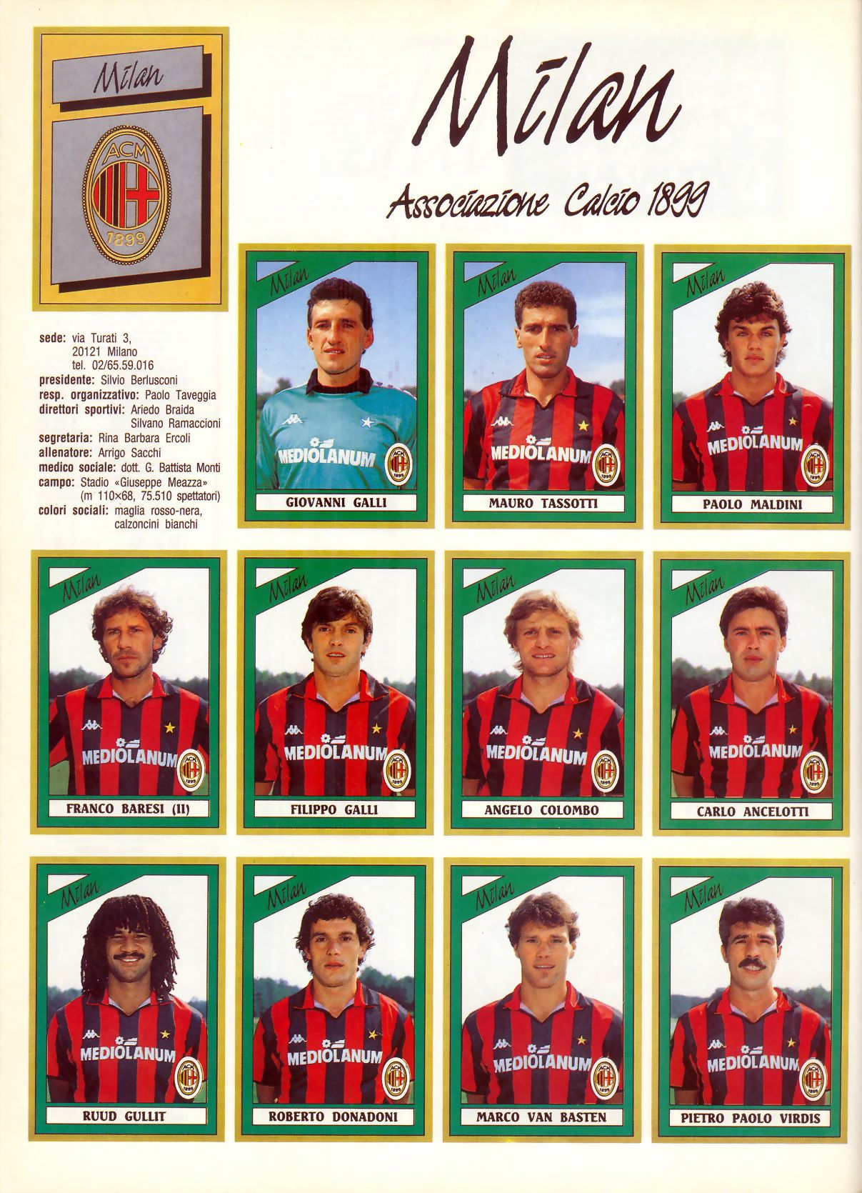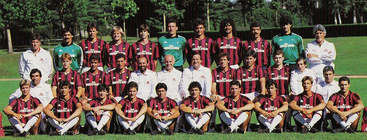 Após algumas experiências nas primeiras rodadas, já é possível perceber um time-base: Giovanni Galli, titular da seleção italiana na última Copa, é o camisa 1. A defesa, postada em linha, contrariando a configuração com a qual o futebol do país se acostumara, tem Tassotti na lateral direita e Maldini na esquerda, com Baresi comandando a linha de impedimento ao lado de Filippo Galli pelo centro. No meio, quase numa outra linha, Colombo é o jogador mais defensivo, com Ancelotti ligeiramente mais à frente, fazendo um misto de volante e armador, tendo Donadoni mais aberto pelo lado direito.