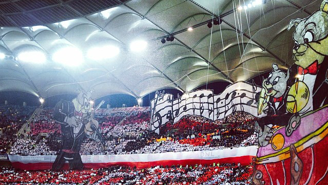 O Dinamo Bucareste tinha uma missão quase impossível nesta quinta-feira diante de seu rival Steaua. Depois de perder o jogo de ida das quartas de final da Copa da Romênia por 5 a 2, não seria nada simples reverter essa desvantagem justamente contra o melhor time do país, que também lidera o Campeonato Romeno. Diante disso, o que fazer então? Roubar a cena com uma bela festa antes da bola rolar, ora. Ao final do jogo, chamado de “Dérbi Eterno”, que acabou em um empate, o destaque ficou sendo mesmo as belas imagens protagonizadas pela torcida do Dinamo e por uma pequena orquestra.