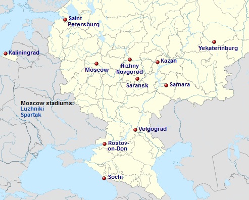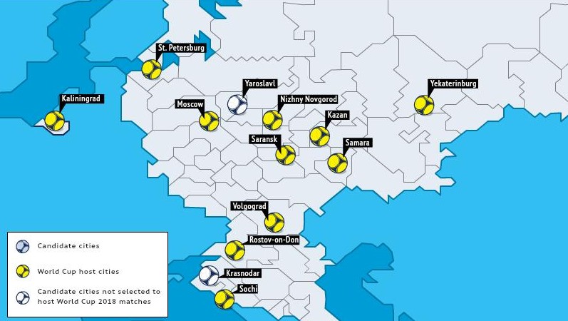 Foram criadas quatro “áreas geográficas”, utilizando as palavras da própria Fifa. A Central inclui dois estádios na capital russa, o Luzhniki e o novo do Spartak Moscou (que venceu, inicialmente, a concorrência com o do Dynamo); a Norte tem São Petersburgo e o enclave russo Kaliningrado; a Sul conta com Sochi e Rostov-na-Donu; já a Volga, nome de um dos principais rios do país, possui o maior número de cidades, com Nizhny Novgorod, Samara, Saransk, Volvogrado e Kazan (que receberá a Universíada em 2013). Sem local especificado aparece Ekaterimburgo, local mais à leste entre todas as sedes, na fronteira da Europa com a Ásia nos Montes Urais, mas ainda em território europeu – apesar de 3 mil km distante de Kaliningrado.