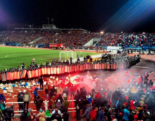 Os problemas no jogo, que aconteceu na cidade de Yaroslavl, começaram antes mesmo da partida. Após o apito inicial, a confusão prosseguiu e se intensificou perto do final da primeira etapa, quando torcedores do Spartak entraram em confronto com os policiais que faziam a segurança da partida. Cadeiras, sinalizadores e bombas de fumaça foram arremessadas em direção ao gramado, e, quando o segundo tempo se iniciou, a polícia ainda não havia controlado a situação.