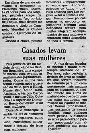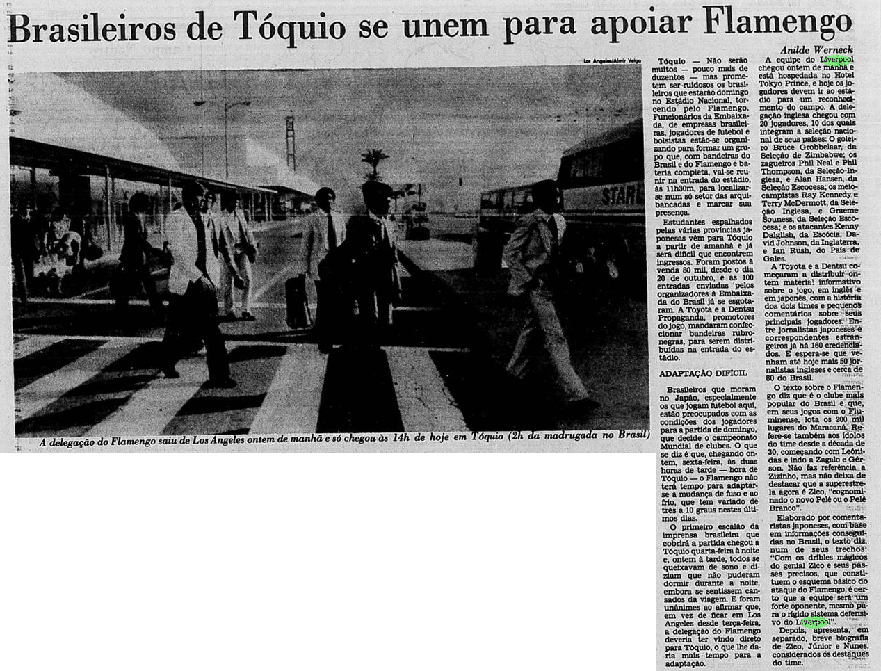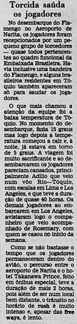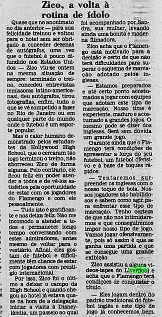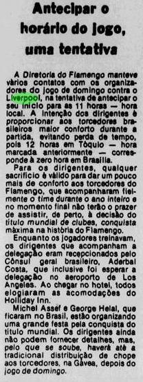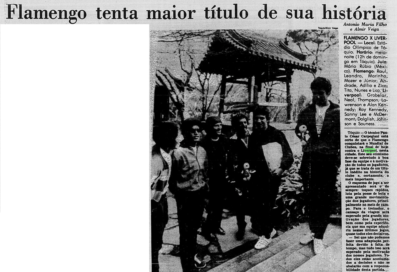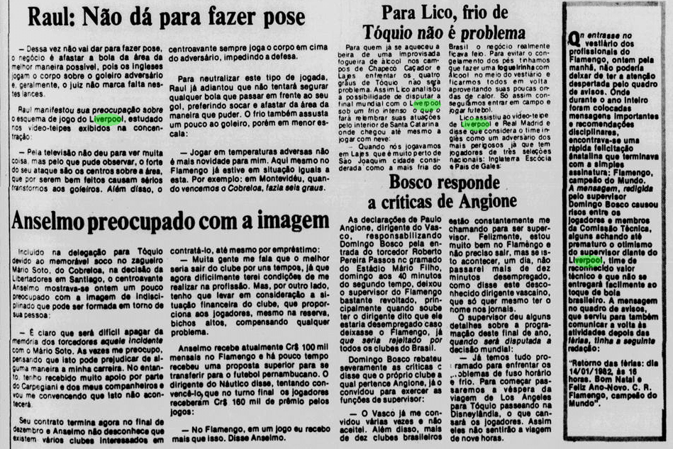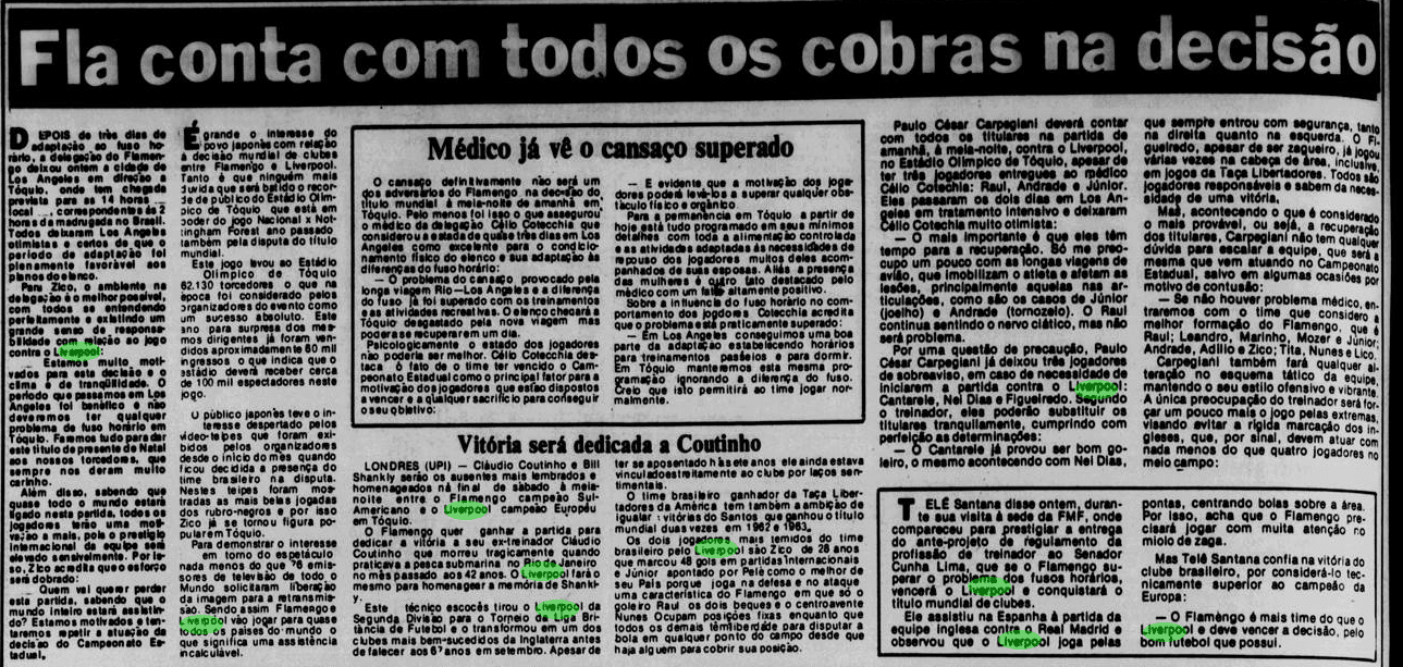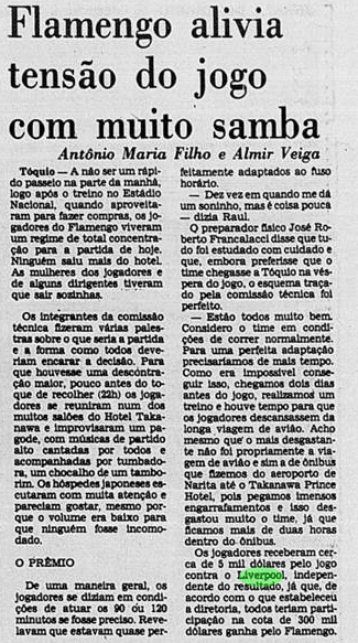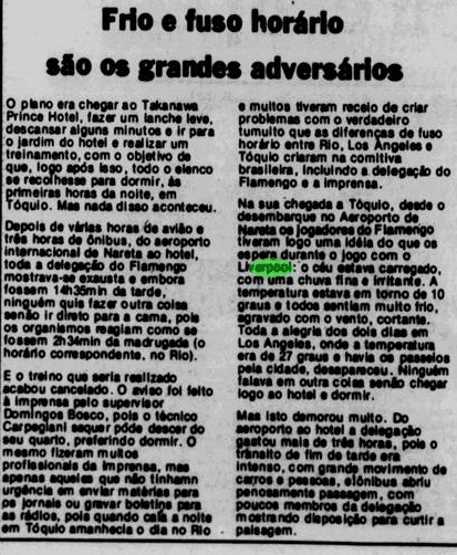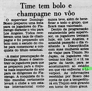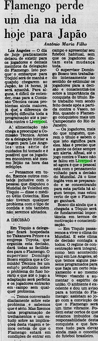 O Flamengo viajaria na noite de 7 de dezembro, uma segunda-feira. Adílio era o único que embarcaria depois, com casamento marcado. O time primeiro passaria alguns dias em Los Angeles, para se acostumar com a mudança de fuso horário, antes de viajar para Tóquio na quinta-feira. A final aconteceria no domingo. O noticiário daquele dia até começava a apresentar o Liverpool, mas estava realmente voltado a falar sobre o título carioca. Destaque também à história do “Ladrilheiro”.
