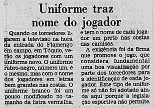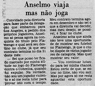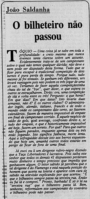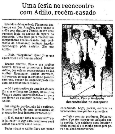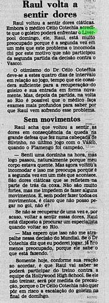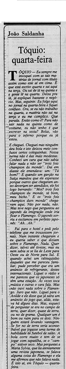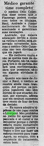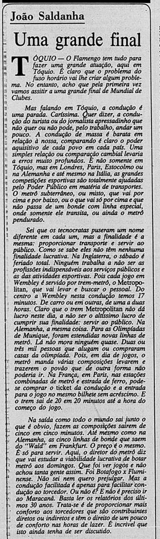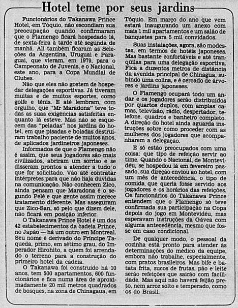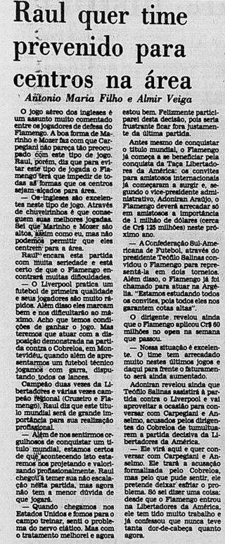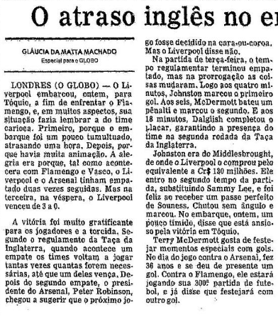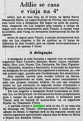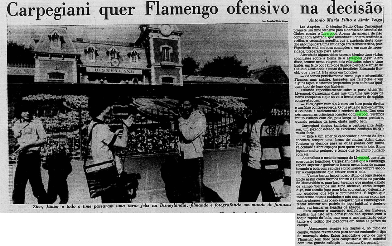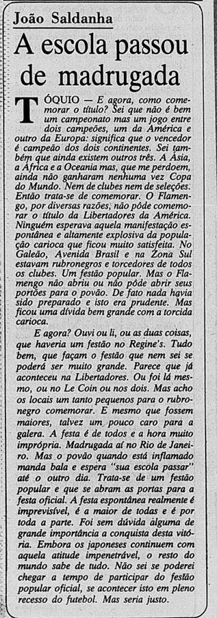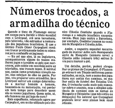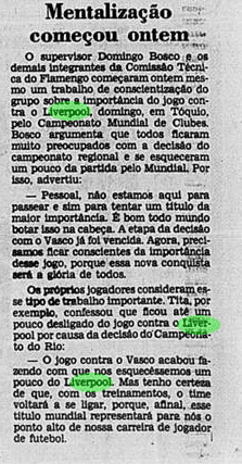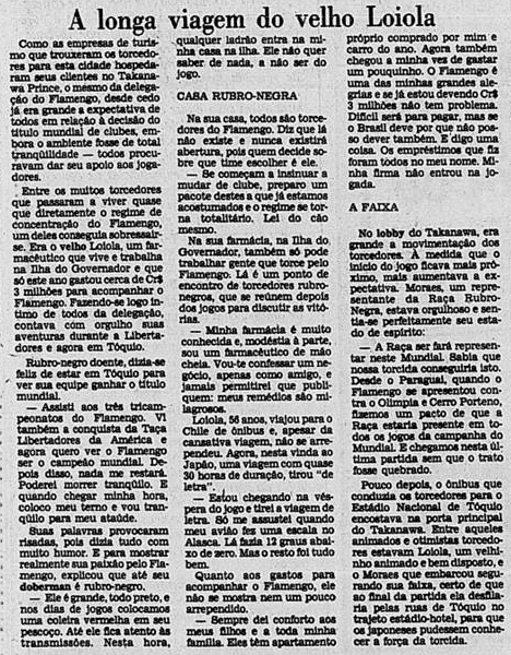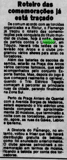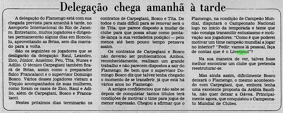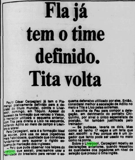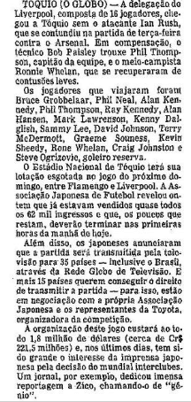 O Flamengo viajaria na noite de 7 de dezembro, uma segunda-feira. Adílio era o único que embarcaria depois, com casamento marcado. O time primeiro passaria alguns dias em Los Angeles, para se acostumar com a mudança de fuso horário, antes de viajar para Tóquio na quinta-feira. A final aconteceria no domingo. O noticiário daquele dia até começava a apresentar o Liverpool, mas estava realmente voltado a falar sobre o título carioca. Destaque também à história do “Ladrilheiro”.