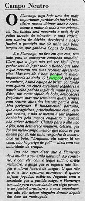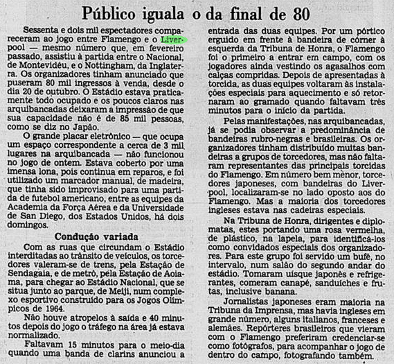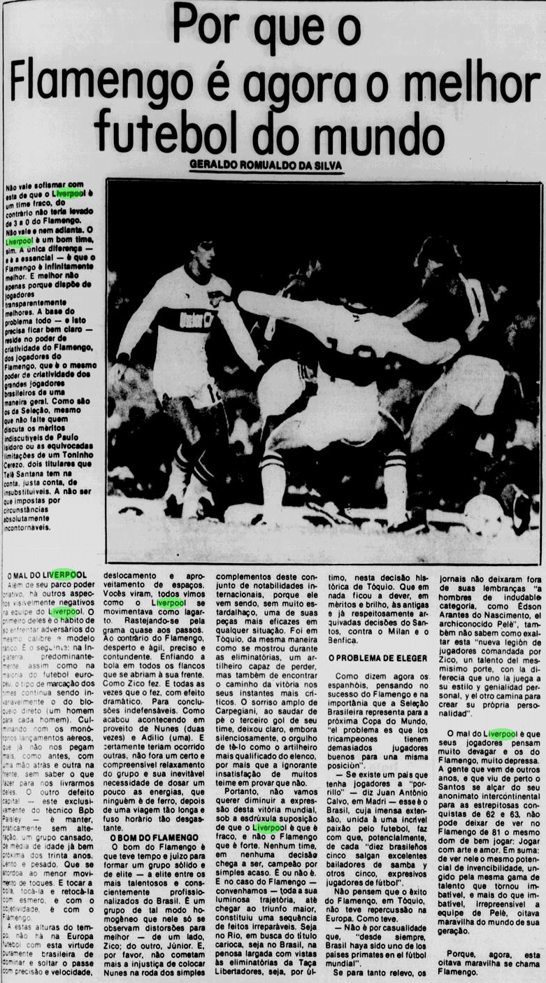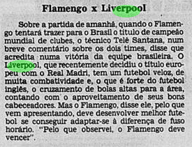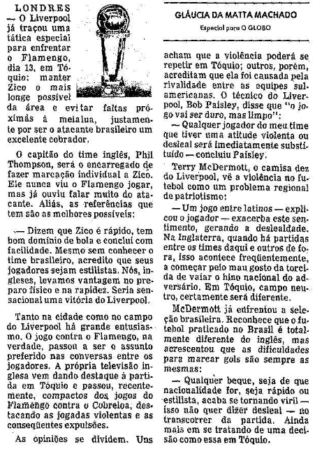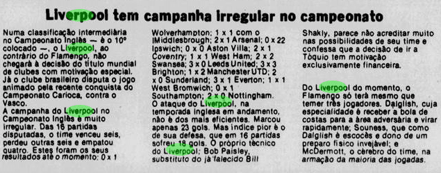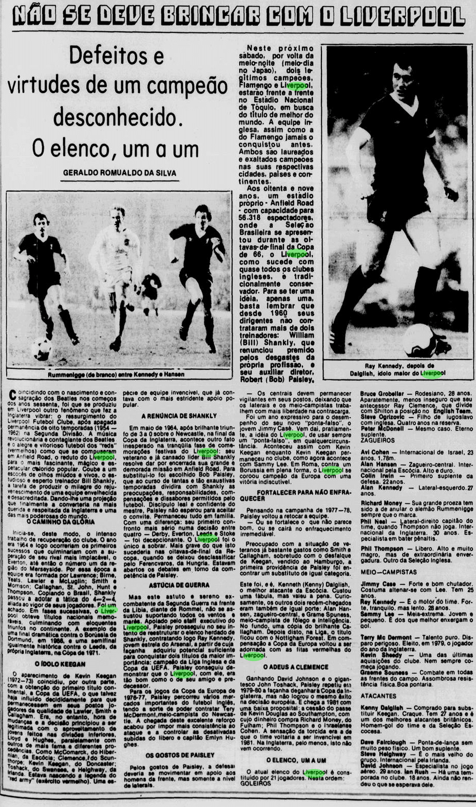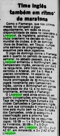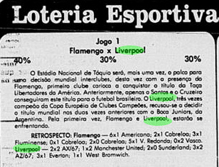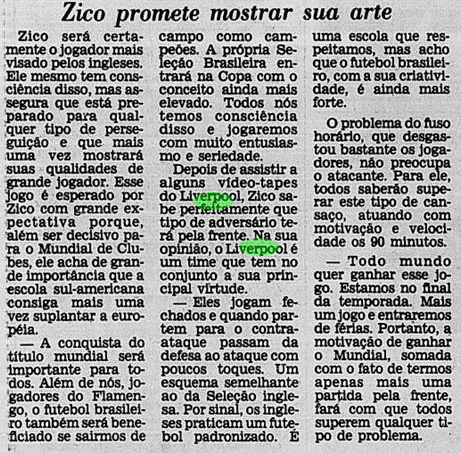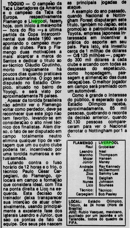 A loteria esportiva fazia prognósticos equilibrados ao Mundial. Por mais que o Flamengo atravessasse ótima fase e chegasse mais embalado ao Japão, o Liverpool merecia respeito – sem que os jornalistas deixassem de ponderar as oscilações no período, a falta de encaixe coletivo ou as desconfianças sobre o novato goleiro Bruce Grobbelaar. Os três títulos continentais conquistados nos cinco anos anteriores, afinal, falavam por si. E assim se pautou o noticiário ao redor da final em Tóquio: com empolgação por aquilo que poderia ser feito pelo Fla, mas sem desconsiderar os oponentes.