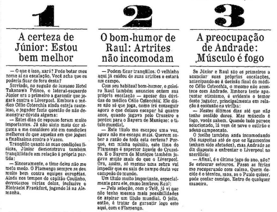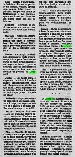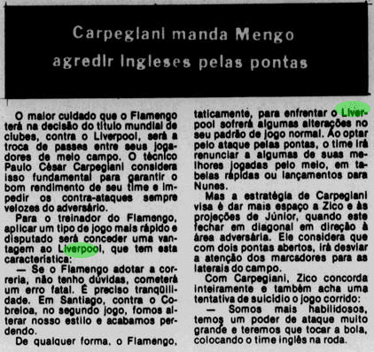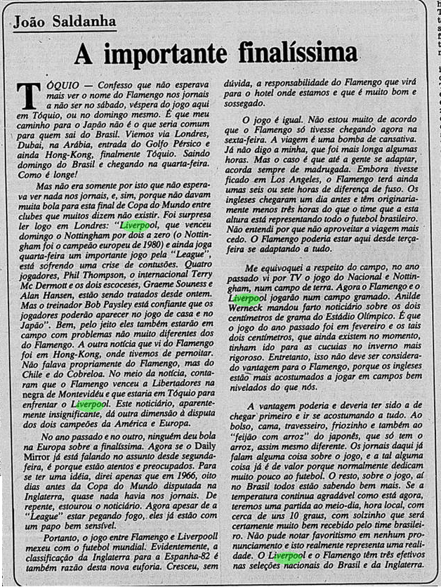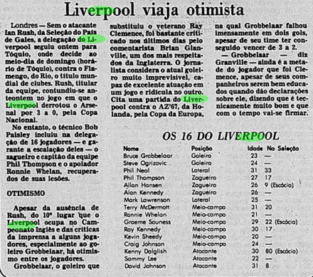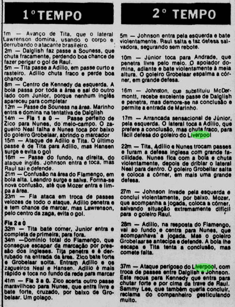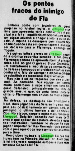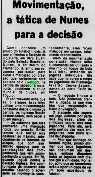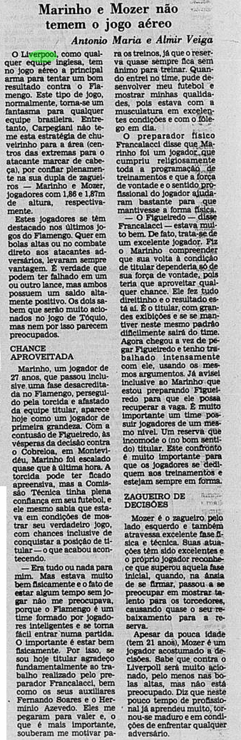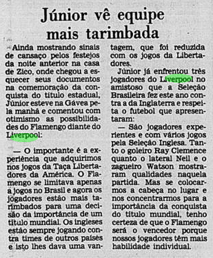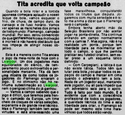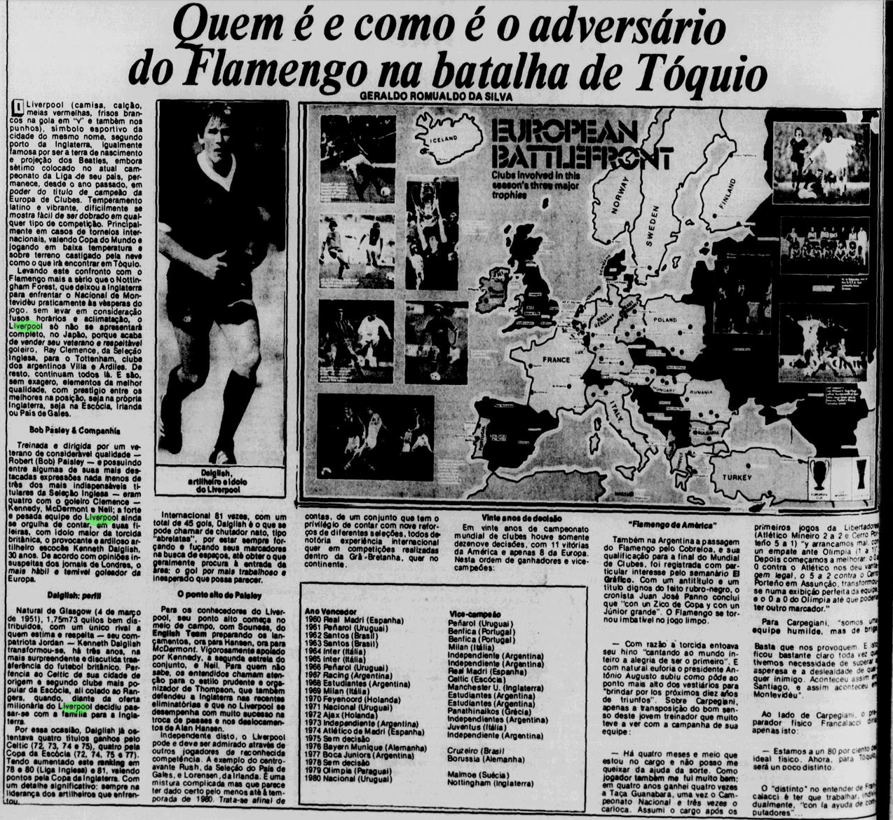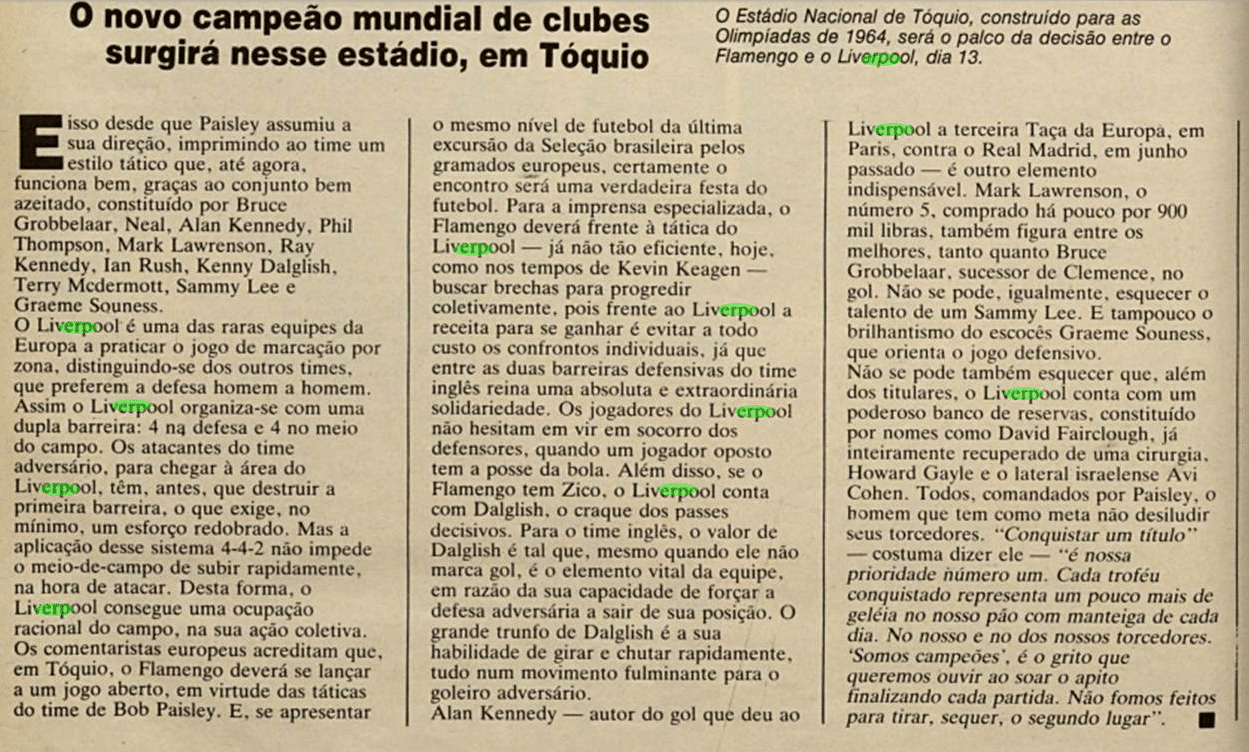 A loteria esportiva fazia prognósticos equilibrados ao Mundial. Por mais que o Flamengo atravessasse ótima fase e chegasse mais embalado ao Japão, o Liverpool merecia respeito – sem que os jornalistas deixassem de ponderar as oscilações no período, a falta de encaixe coletivo ou as desconfianças sobre o novato goleiro Bruce Grobbelaar. Os três títulos continentais conquistados nos cinco anos anteriores, afinal, falavam por si. E assim se pautou o noticiário ao redor da final em Tóquio: com empolgação por aquilo que poderia ser feito pelo Fla, mas sem desconsiderar os oponentes.