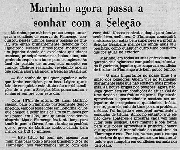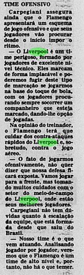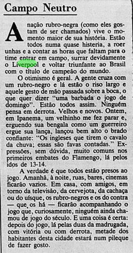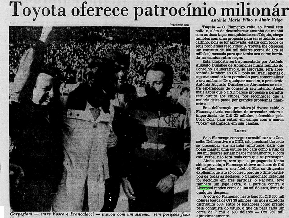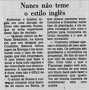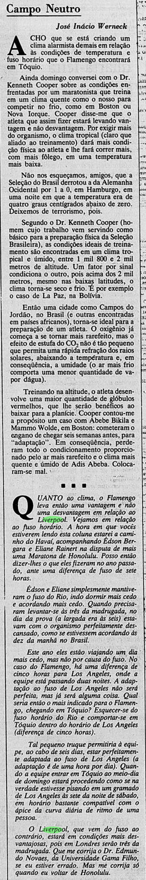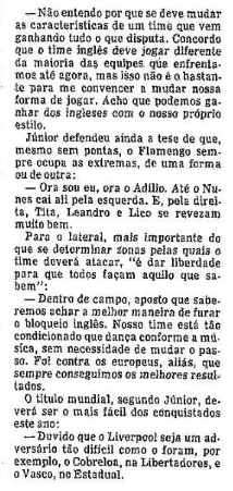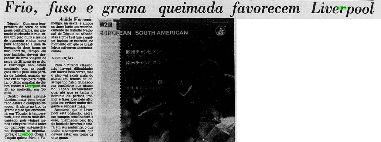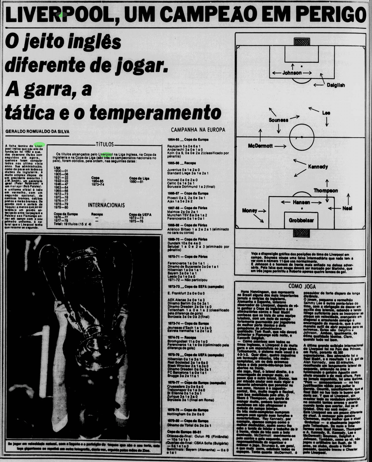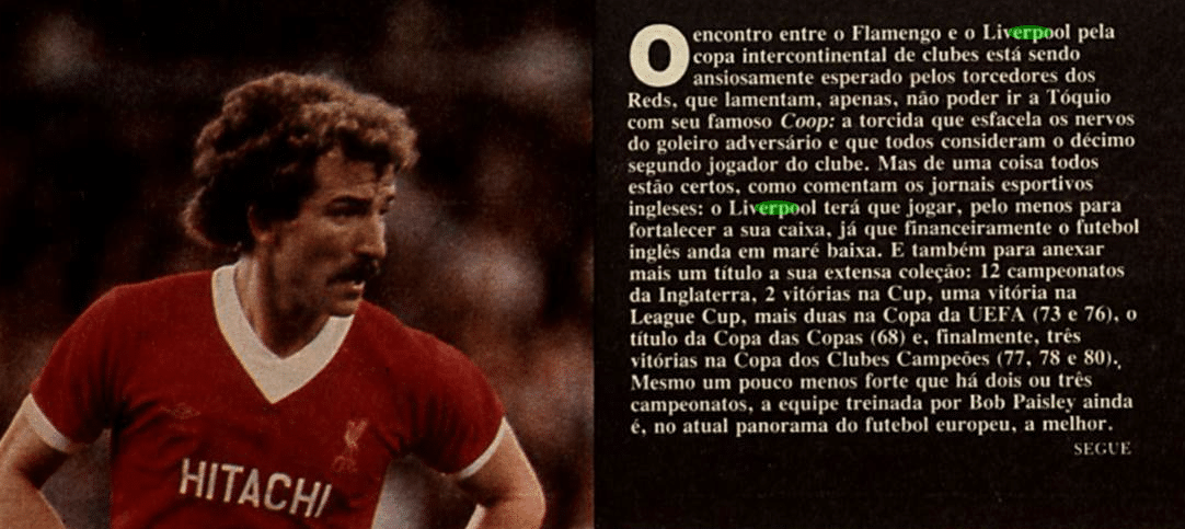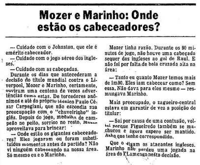 A loteria esportiva fazia prognósticos equilibrados ao Mundial. Por mais que o Flamengo atravessasse ótima fase e chegasse mais embalado ao Japão, o Liverpool merecia respeito – sem que os jornalistas deixassem de ponderar as oscilações no período, a falta de encaixe coletivo ou as desconfianças sobre o novato goleiro Bruce Grobbelaar. Os três títulos continentais conquistados nos cinco anos anteriores, afinal, falavam por si. E assim se pautou o noticiário ao redor da final em Tóquio: com empolgação por aquilo que poderia ser feito pelo Fla, mas sem desconsiderar os oponentes.