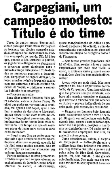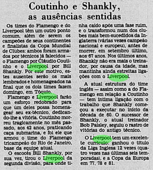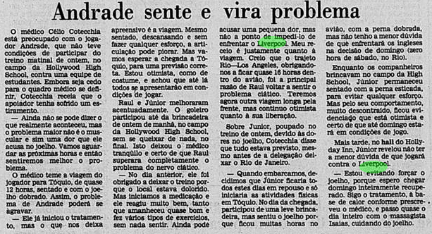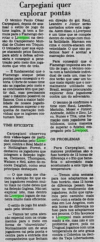 Carpegiani comentava suas estratégias para encarar o Liverpool. Demonstrava conhecimento sobre os Reds e prometia uma postura ofensiva. No entanto, o treinador ganhava nova preocupação. Depois de Raul, o volante Andrade e o lateral Júnior também lidavam com problemas físicos. O time fazia treinos leves, antes de seguir a Tóquio. Já o Liverpool também pegava o seu voo rumo ao Japão, após derrotar o Arsenal. No Jornal dos Sports, Geraldo Romualdo Silva dava mais uma aula sobre o time, destrinchando a história e falando sobre cada um dos jogadores. E a organização do Mundial confirmava que os 62 mil ingressos estavam esgotados, enquanto a transmissão ao vivo seria feita a 35 países.