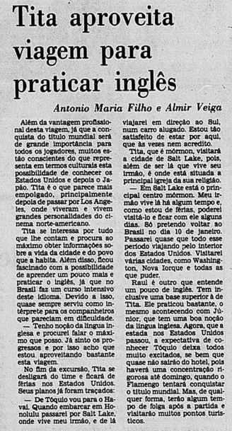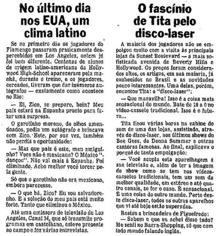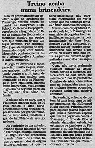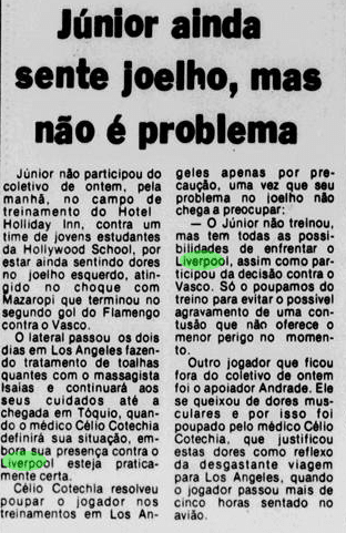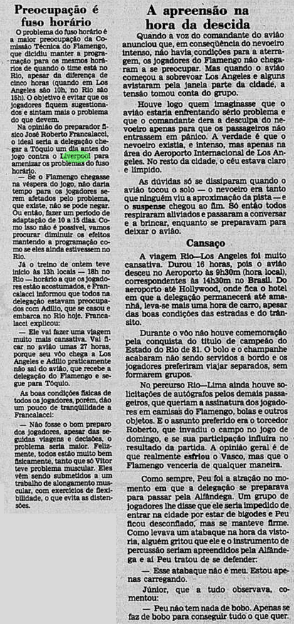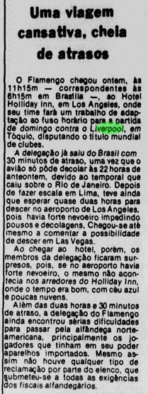 O Flamengo embarcou para Los Angeles e o noticiário sobre Tóquio vinha muito mais recheado. Falava sobre o cronograma e destacava o clima familiar, com muitas esposas viajando junto. Além disso, o Jornal do Brasil destacava a maneira como o Liverpool estaria “em vantagem” pelo fuso menor e por estar mais acostumado à temperatura. O gramado, que geraria reclamações dos ingleses, também era visto como desfavorável aos rubro-negros. Os jogadores começavam a traçar suas estratégias, enquanto Carpegiani falava em atuar pelas pontas e ressaltava como o rendimento dos atletas adversários era maior no clube, se comparado à seleção. Menção ainda a Anselmo, que agrediu Mario Soto na final da Libertadores e não poderia atuar, mas foi mantido no grupo a pedido dos companheiros.