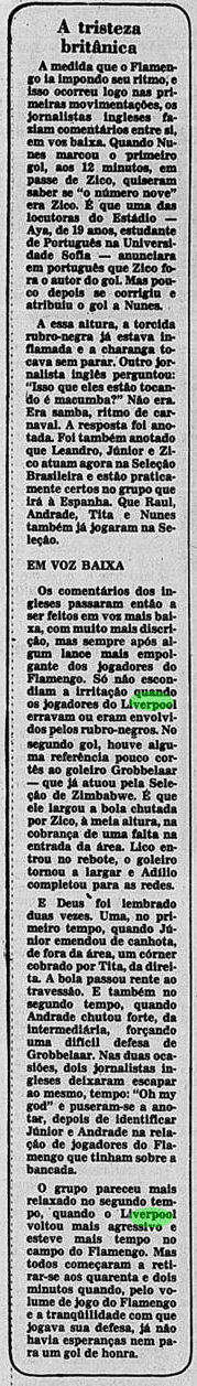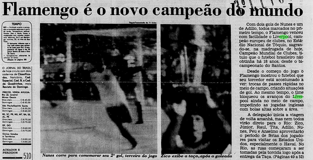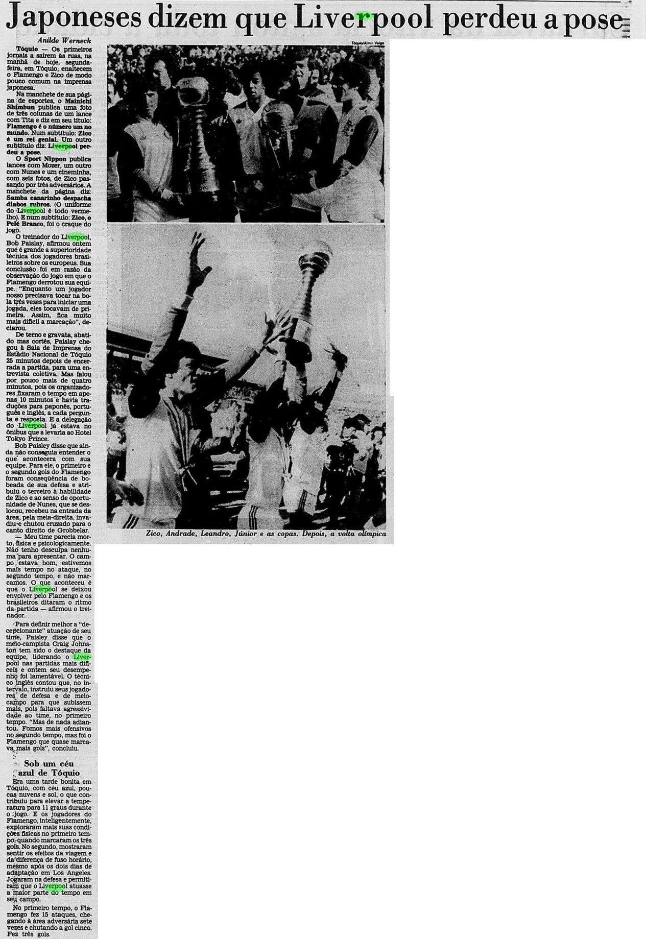 Como o jogo aconteceu no começo da madrugada, as edições matutinas dos jornais trouxeram apenas matérias mais frias, sem falar do resultado. Os relatos do jogo saíram apenas nas tiragens posteriores. A pressa fica visível por alguns erros básicos, incluindo na escalação do Liverpool. Entretanto, unânime era a maneira como o Flamengo dominou a partida durante o primeiro tempo. Zico deu seu show, Nunes marcou dois gols e Adílio também fez o seu. A manchetes ainda falavam sobre a loucura que tomou o Rio durante a madrugada.