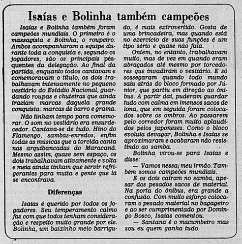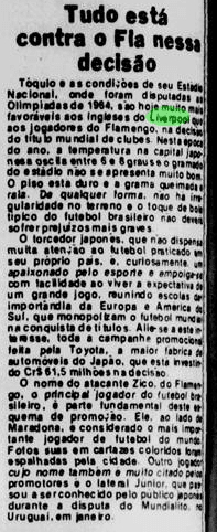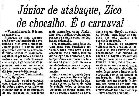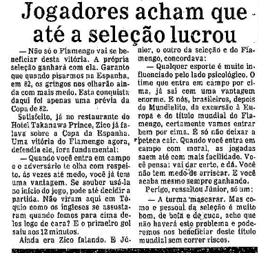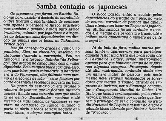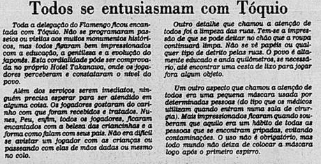 Dentro desta perspectiva, relembramos um pouco como foi vivido este passado. Abaixo, dia após dia, tentamos retratar o clima através de recortes dos jornais cariocas da época (Jornal do Brasil, Jornal dos Sports, O Globo), além das revistas Manchete e Placar. Cada data possui um breve resumo, que introduz as notas dos periódicos. A cobertura inclui as notícias ligadas a Tóquio publicadas a partir de 7 de dezembro, logo após a conquista do Campeonato Carioca, até 14 de dezembro, com o rescaldo da vitória por 3 a 0 no dia 13.