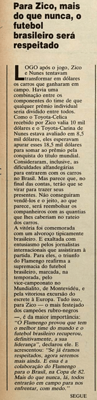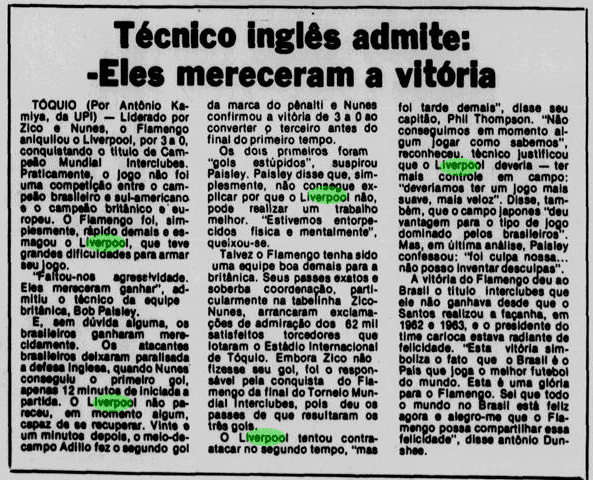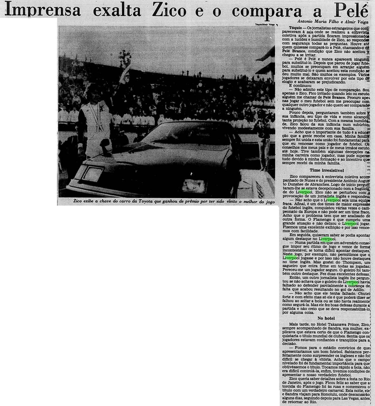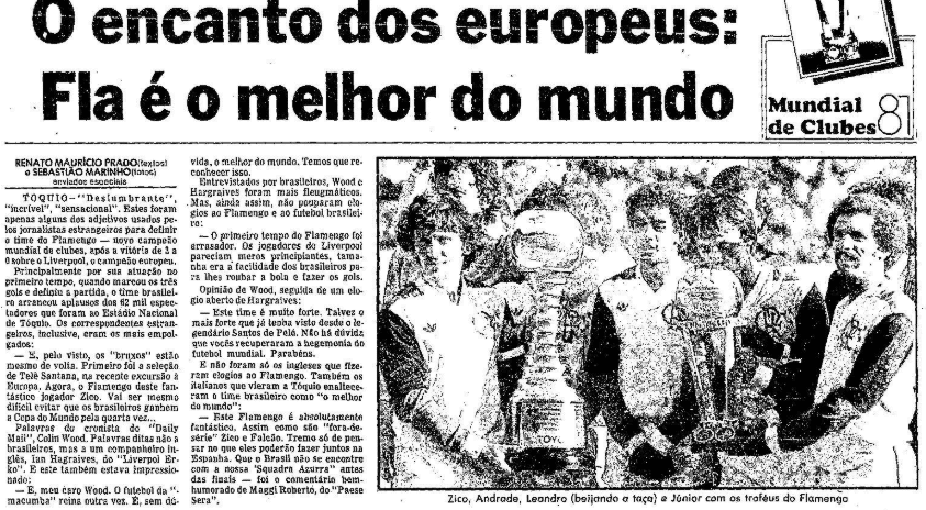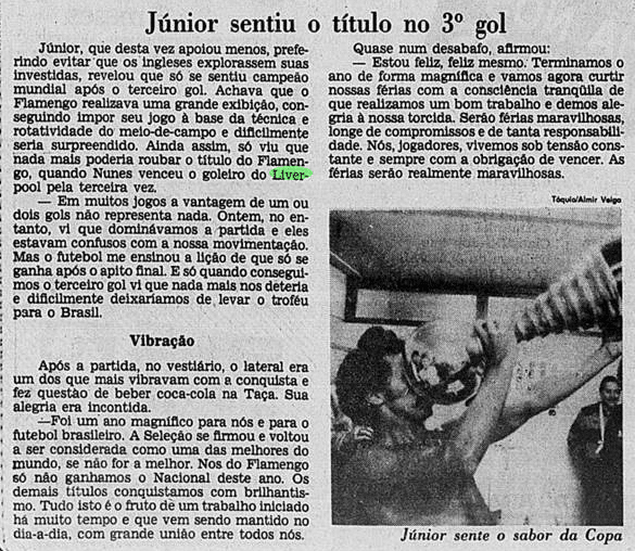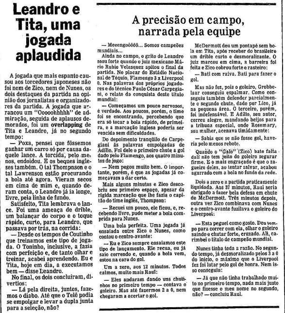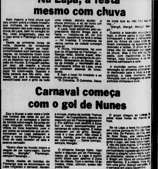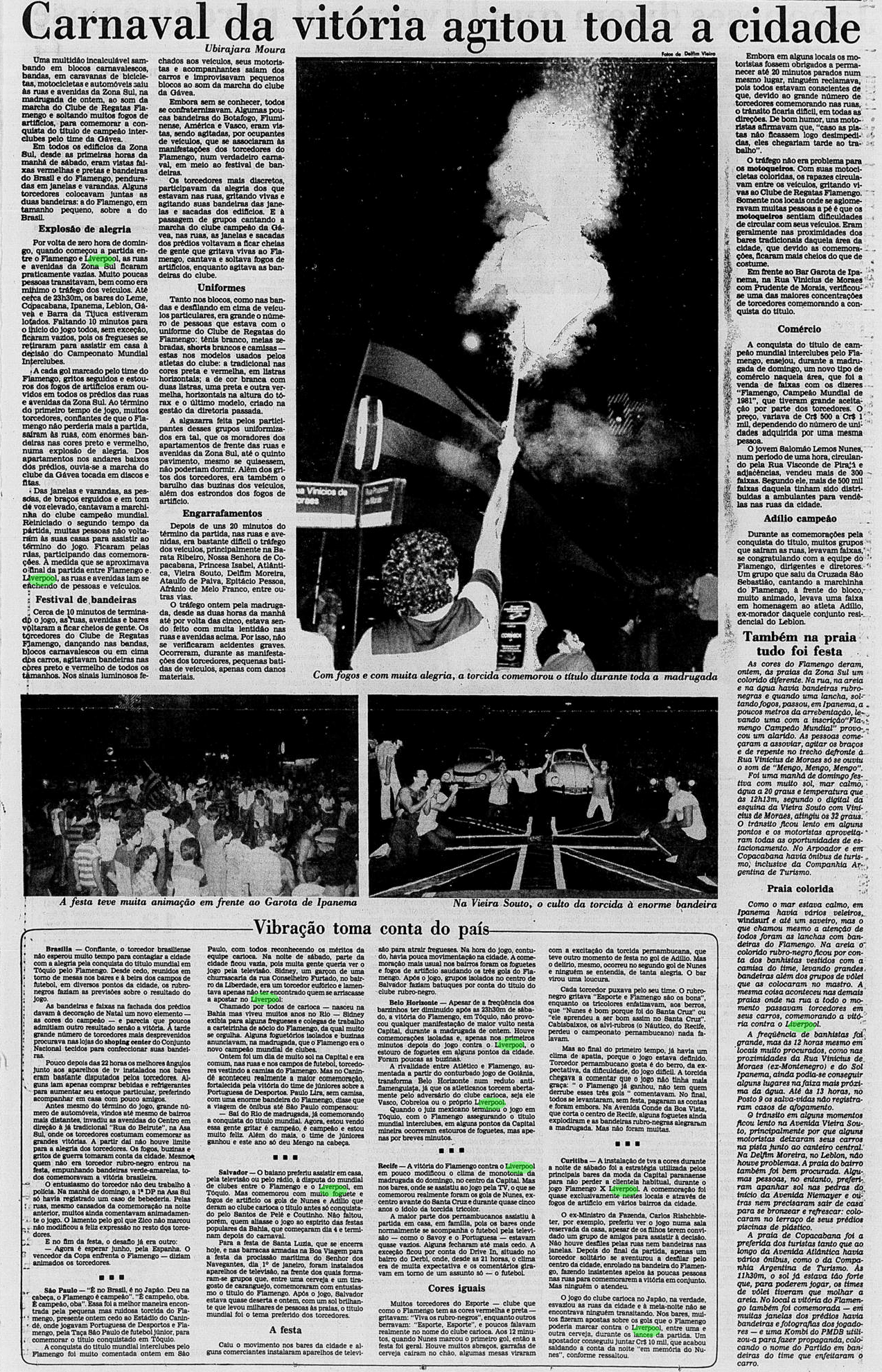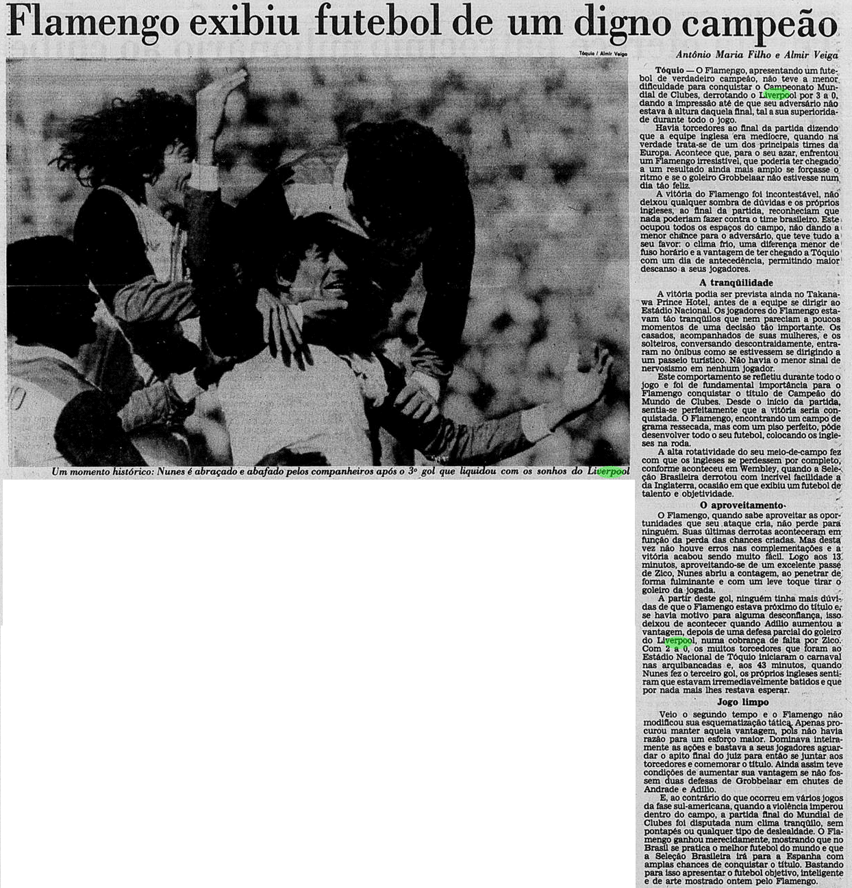 A exaltação máxima. Os jornais repercutiam o sentimento dos jogadores e as grandes atuações. Zico, Nunes, Carpegiani, Raul: todos descreviam o que representava aquela vitória. O Liverpool, do outro lado, admitia os méritos do Flamengo. Os rubro-negros faziam um carnaval em Tóquio, enquanto os relatos do Brasil expandiam a loucura por várias cidades. Embora nem todos os jogadores fossem retornar diretamente ao Rio de Janeiro, alguns parando em Honolulu, prometia-se também uma recepção grandiosa. E ficava expressa a maneira como o Fla se valorizou com o triunfo incontestável, assim como deixou em evidência o futebol brasileiro.