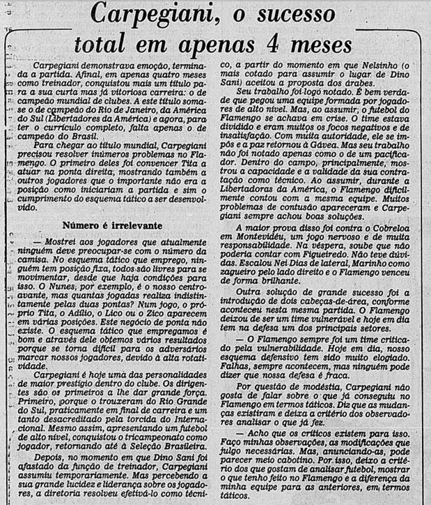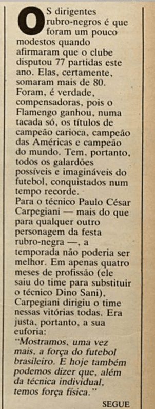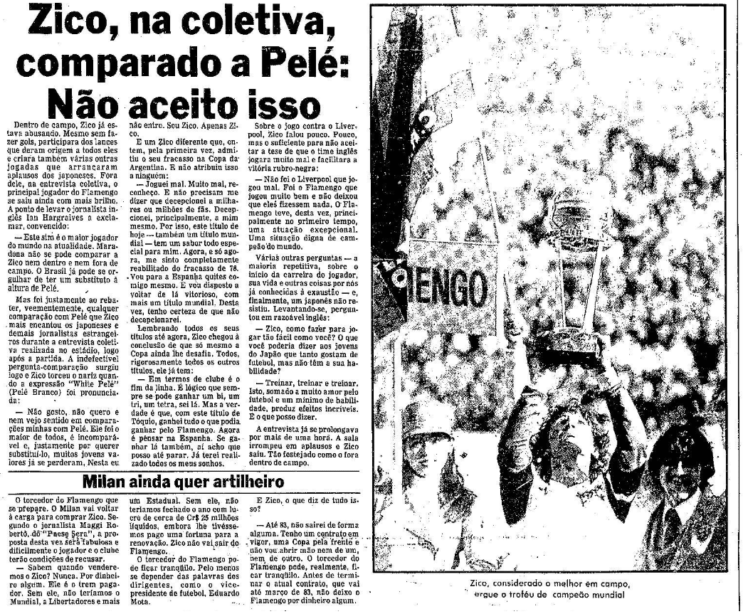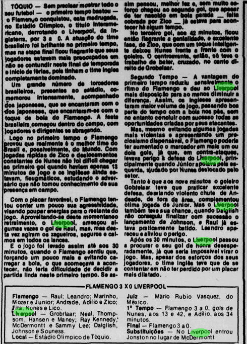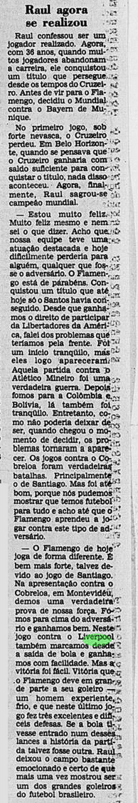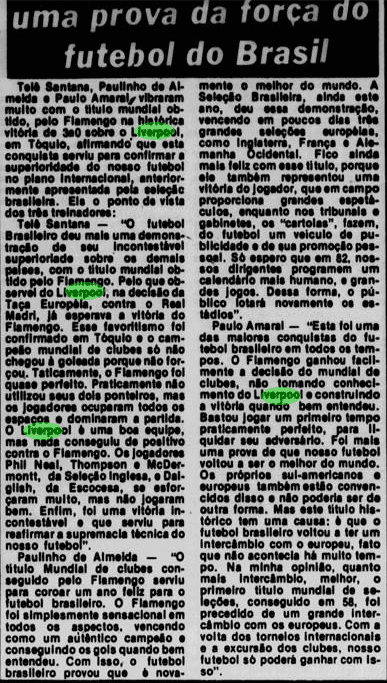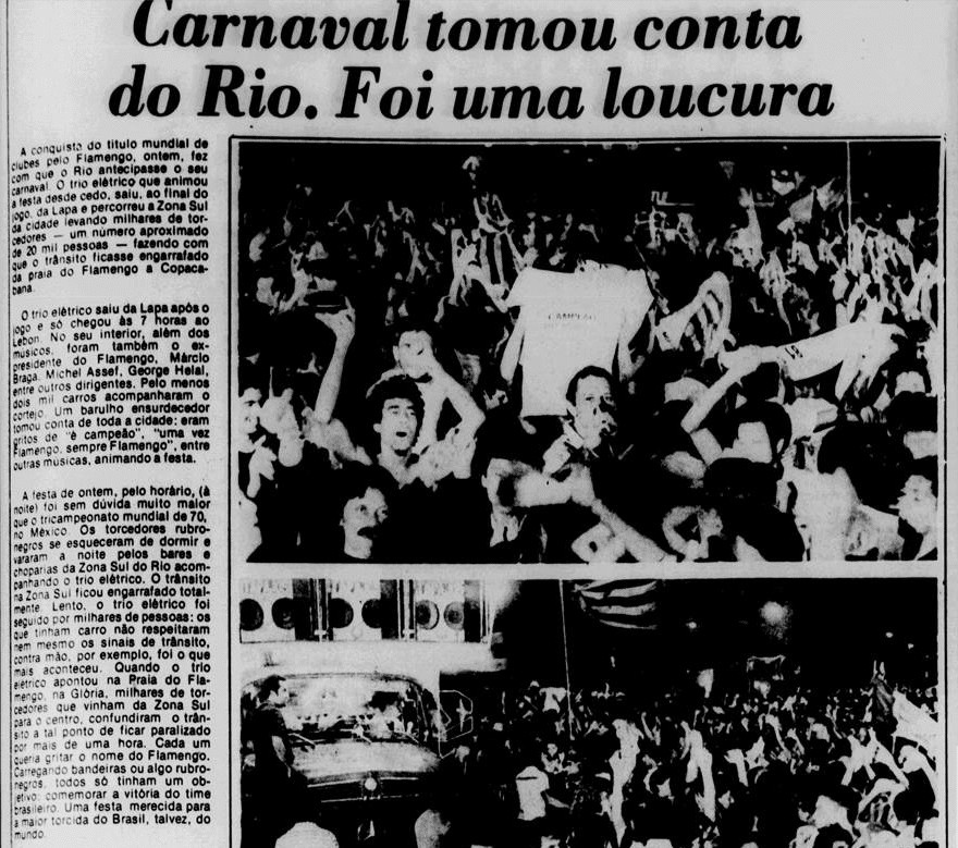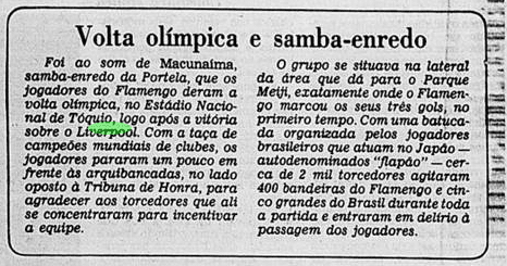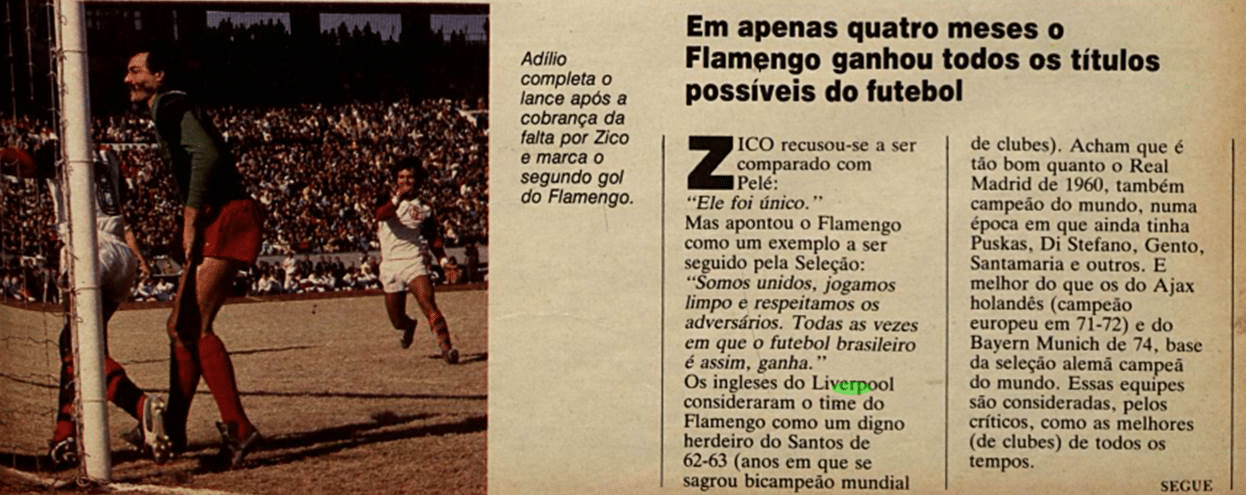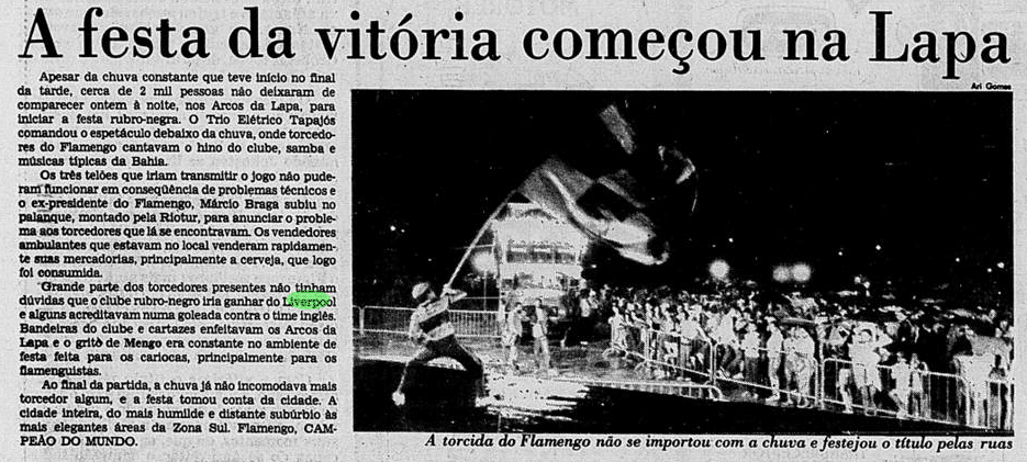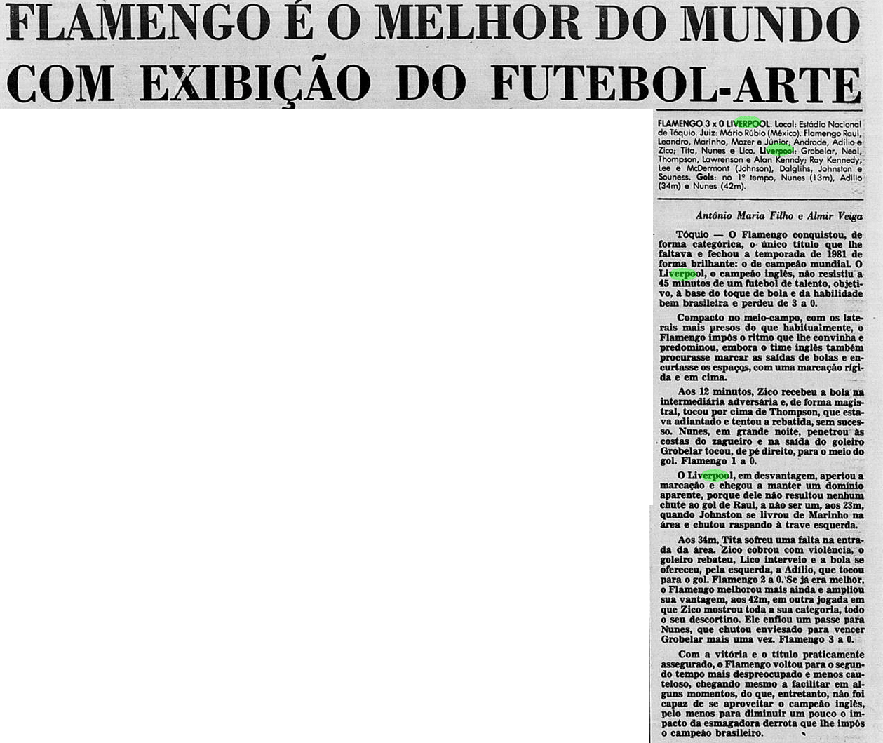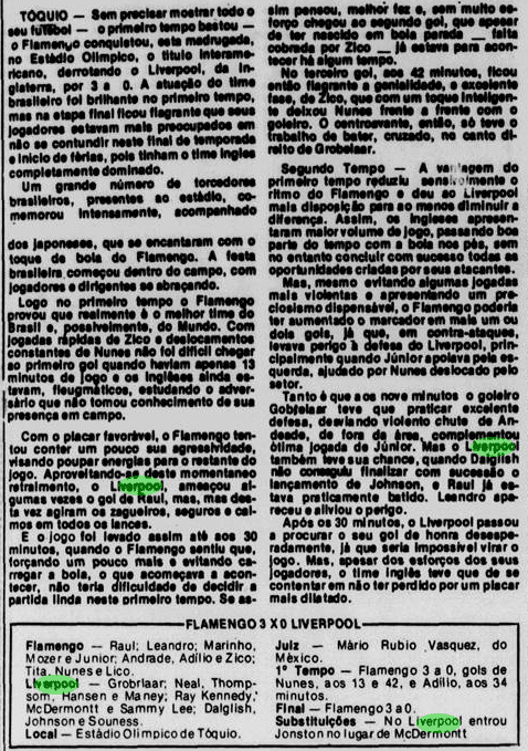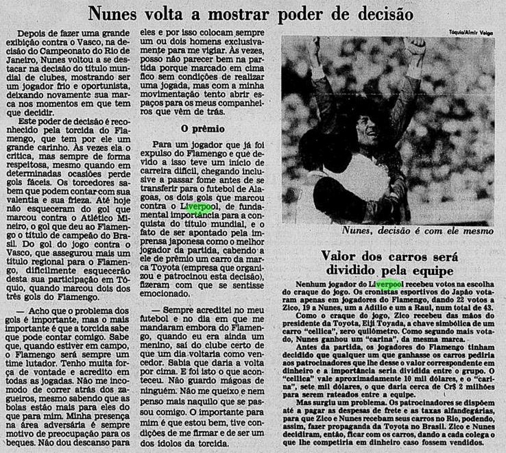 A exaltação máxima. Os jornais repercutiam o sentimento dos jogadores e as grandes atuações. Zico, Nunes, Carpegiani, Raul: todos descreviam o que representava aquela vitória. O Liverpool, do outro lado, admitia os méritos do Flamengo. Os rubro-negros faziam um carnaval em Tóquio, enquanto os relatos do Brasil expandiam a loucura por várias cidades. Embora nem todos os jogadores fossem retornar diretamente ao Rio de Janeiro, alguns parando em Honolulu, prometia-se também uma recepção grandiosa. E ficava expressa a maneira como o Fla se valorizou com o triunfo incontestável, assim como deixou em evidência o futebol brasileiro.