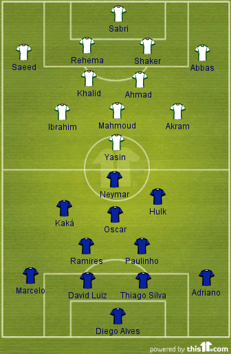 Brasil Diego Alves; Adriano, Thiago Silva, David Luiz e Marcelo; Paulinho (Fernando, 44’/2T) e Ramires (Sandro, 35’/2T); Hulk (Thiago Neves, 28’/2T), Oscar (Giuliano, 35’/2T) e Kaká (Lucas, 27’/2T); Neymar. Técnico: Mano Menezes |