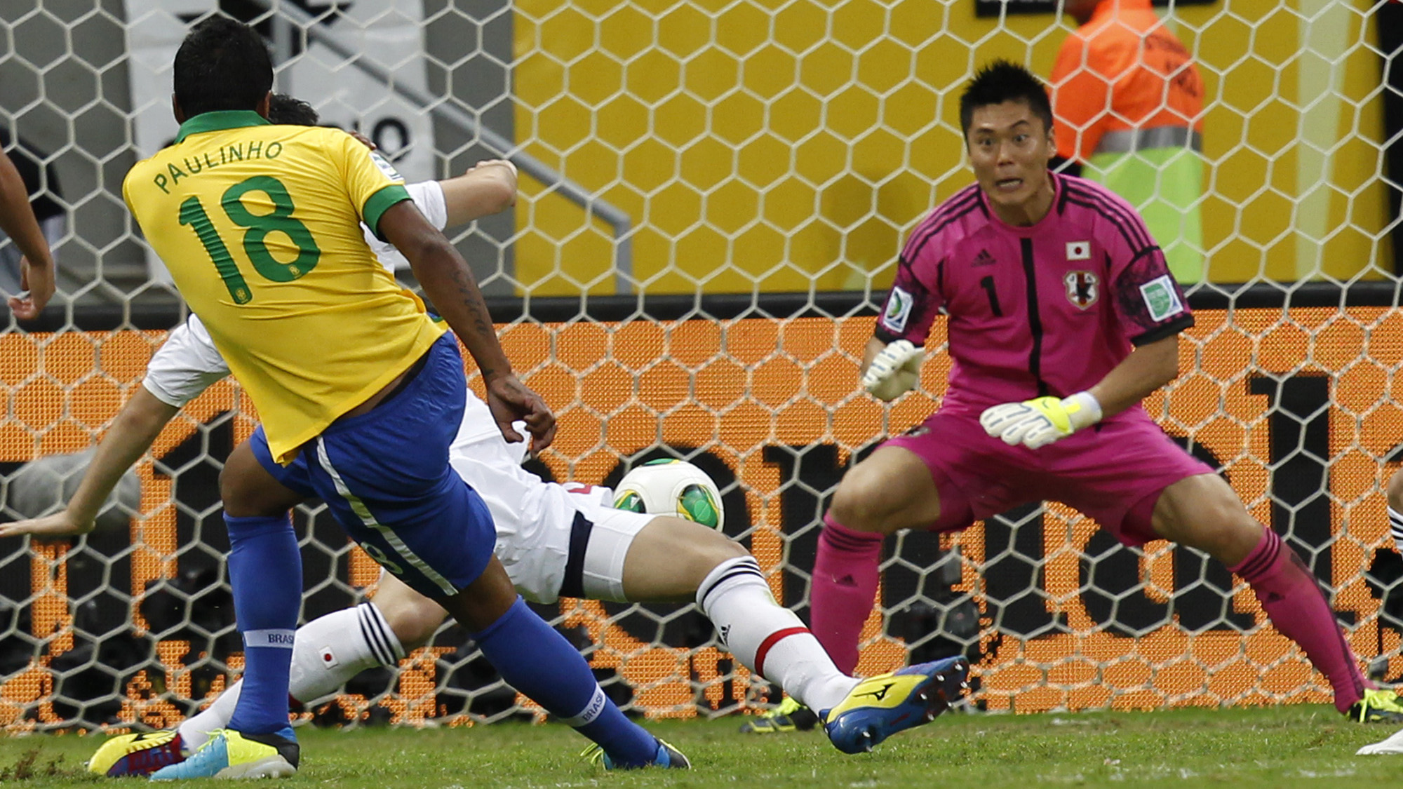 Daniel Alves jogou para a área, Paulinho dominou e bateu rápido. O goleiro Kawashima não segurou: 2 a 0 Brasil.