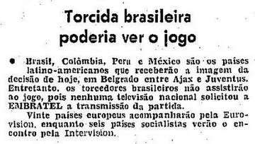 Em maio de 1973, época da final da Copa dos Campeões, o jornal O Globo publicou, logo abaixo de sua matéria sobre a decisão, uma nota que hoje parece inacreditável: “Brasil, Colômbia, Peru e México são os países latino-americanos que receberão a imagem da decisão de hoje, em Belgrado, entre Ajax e Juventus. Entretanto, os torcedores brasileiros não assistirão ao jogo, pois nenhuma televisão nacional solicitou à Embratel a transmissão da partida”.