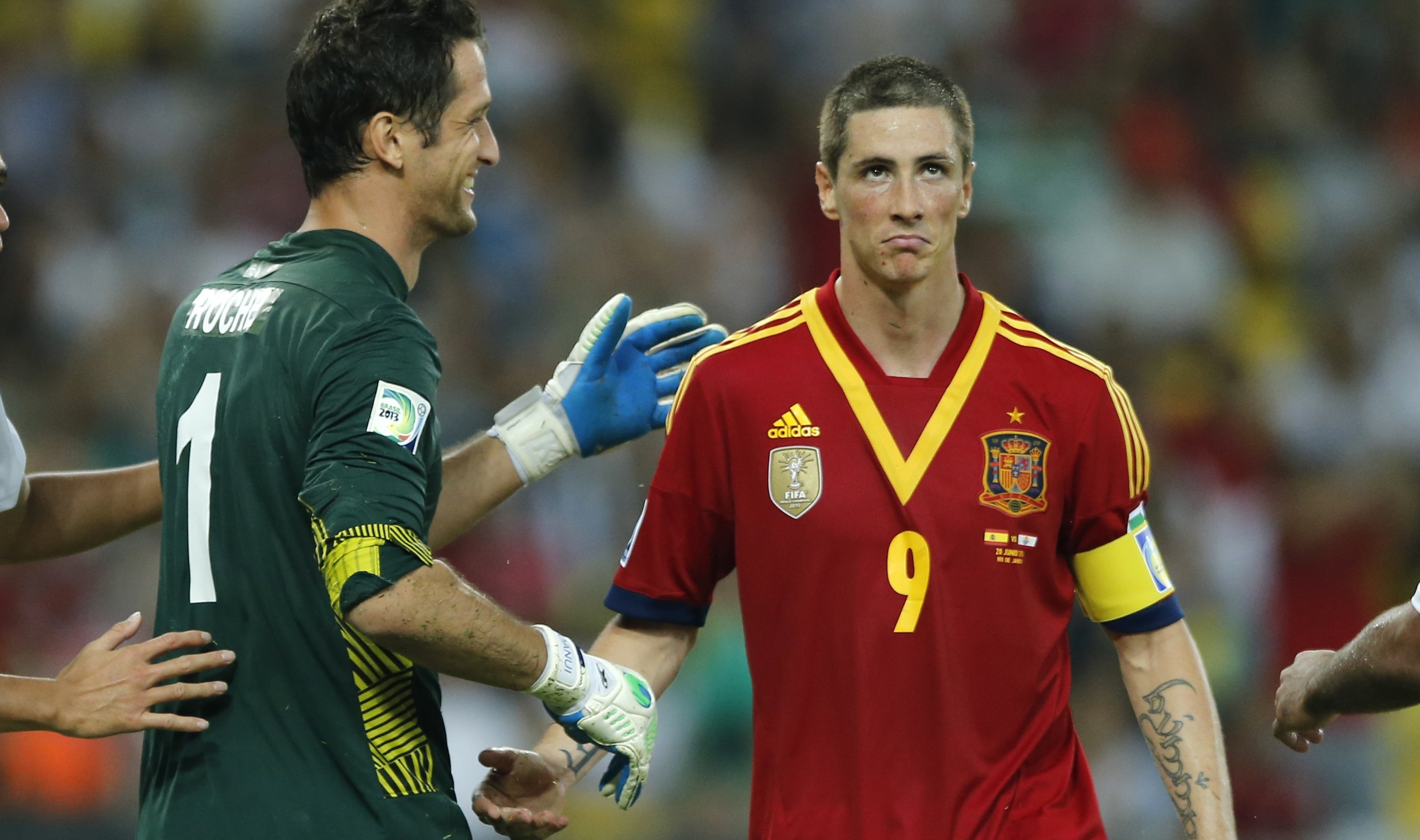 Torres dribla um indefeso Roche para marcar o terceiro gol da Espanha no jogo.