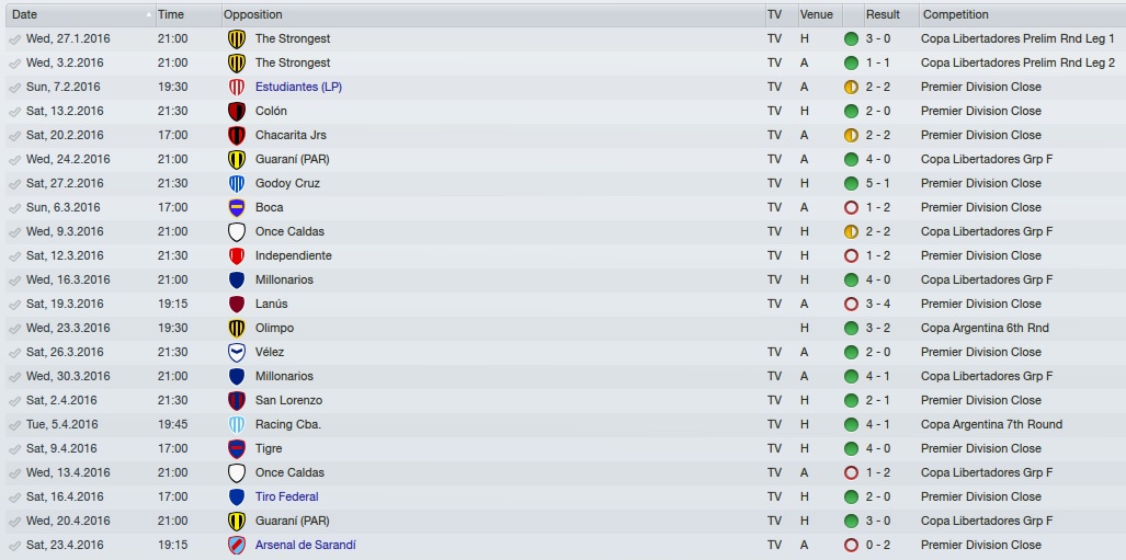 – Na sequência perdemos mais uma no Campeonato Argentino. 4 a 3 para o Lanús. De positivo apenas os gols anotados por Santiago Lamanna. A oscilação continuou com a vitória por 2 a 0 contra o Vélez com gols de Ramirez e Delfino e um inquestionável triunfo por 4 a 1 fora de casa diante do Millonários, com tentos de Ferreyra e Carlos Luna, que anotou três, embora seja reserva.