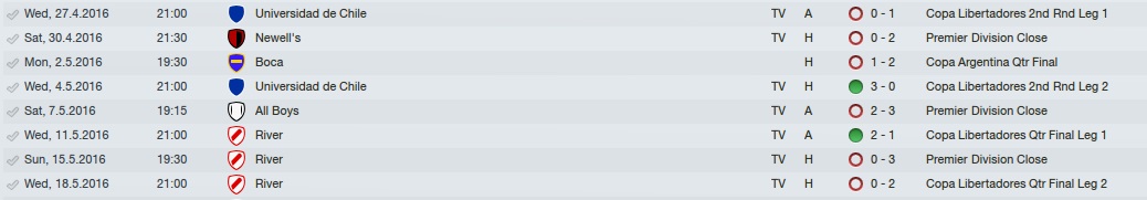 – Bom, funcionou contra La U! Em casa vencemos por 3 a 0. Luna de longa distância, Alfredo Caro após rebote de escanteio e Mercado fizeram os gols. Nosso adversário nas quartas seria o River Plate! Primeiro jogo fora de casa.