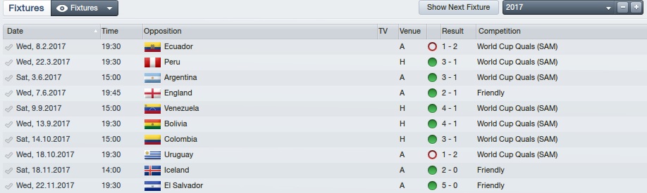 - Na virada de 2016 para 2017 estávamos na terceira posição das Eliminatórias para a Copa da Rússia e começamos com um tropeço diante do Equador: 2 a 1 para eles na altitude de Quito. Um gol de pênalti, um gol em contragolpe e um tento de Isla para descontar para nosotros.