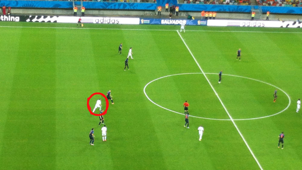 Só que para receber essas bolas enfiadas, o atacante precisa jogar sempre no limite do impedimento e longe do meio-campo. Além das características, esse posicionamento, que pode ser conferido na imagem abaixo, impediu que Diego participasse da troca de bolas. Ele também ficou muitas vezes em posição ilegal: