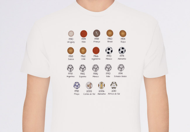 A estampa da camisa da promoção Trivela-TeeNOW homenageia esses símbolos. As bolas das Copas. De todas. Não apenas a partir da Telster de 1970. É a partir de 1930, quando a gente ainda falava “bola de capotão” e ainda havia costura que podia machucar a cabeça de jogadores.